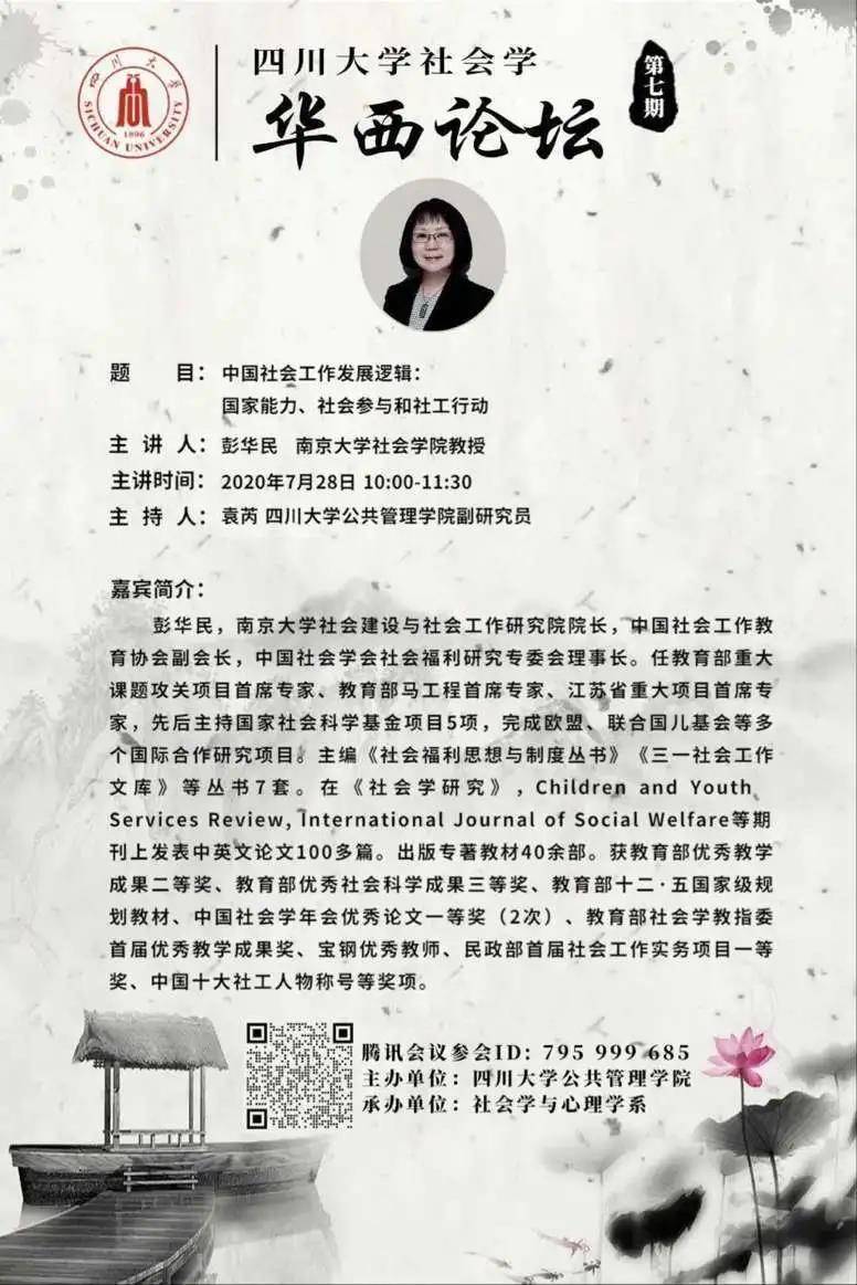 2020年7月28日上午10:00,英国正版365官方网站社会学·华西论坛云系列讲座第七期于线上成功举办。中国社会工作教育协会副会长、中国社会学会社会福利专委会理事长、南京大学社会建设与社会工作研究院经理、社会公司博士生导师彭华民教授开展了题为“中国社会工作发展逻辑:国家能力、社会参与和社工行动”的精彩讲座。讲座由社会学与心理学系袁芮副研究员主持,国内高校社会工作及相关领域研究者、员工共250余人聆听了讲座。