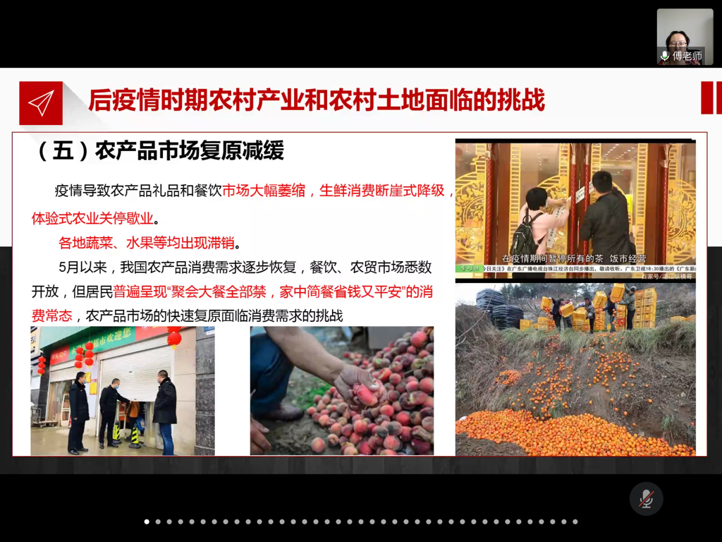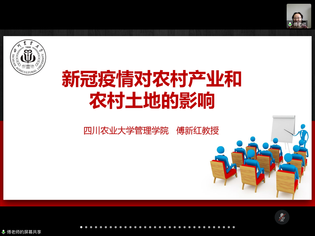 2020年6月30日下午16:15,国务院特殊津贴专家、四川农村发展研究中心常务副主任傅新红教授学术讲座《新冠疫情对农村产业和农村土地的影响》于线上成功举办。英国上市公司365刘润秋教授主持了此次讲座,土地资源管理专业研究生及本科生参加了此次讲座。