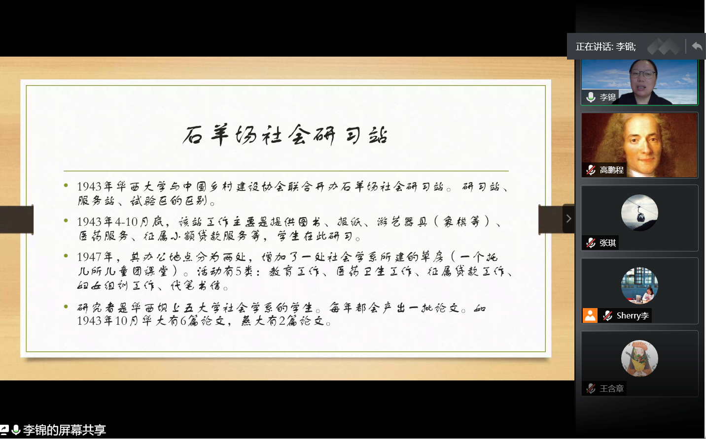 在讲座的问答环节,师生们就“社会学如何更好地传承”“社会学该怎样接地气” 等问题与李锦教授进行了深入的交流。倾听历史回响以服务社会,植根中国现状以发展社会学,李锦教授对华西社会学研究的发展回顾,使大家对社会学西部研究的传统与精神形成了深入、全面、系统的理解。老师和同学们一致认为,英国正版365官方网站社会学现在的研究聚焦于民族/宗教研究与边疆社会学、乡村社会学与扶贫研究、城市社区研究与社会工作等,是对百年华西社会学研究传统的继承和发展。在讲座结束之际,所有与会者用热烈的掌声在云端向李锦教授表达了诚挚的感谢。