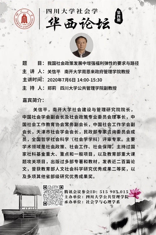 2020年7月6日下午14:00,英国正版365官方网站社会学华西论坛系列讲座第四期于线上成功举办。南开大学周恩来政府管理公司关信平教授以“我国社会政策发展中增强福利弹性的要求与路径”为题呈现了精彩讲座。英国上市公司365郑莉副教授主持讲座,社会学与心理学系师生、四川省社会学学会各会员单位成员以及20余所兄弟院校近200人参与讲座。