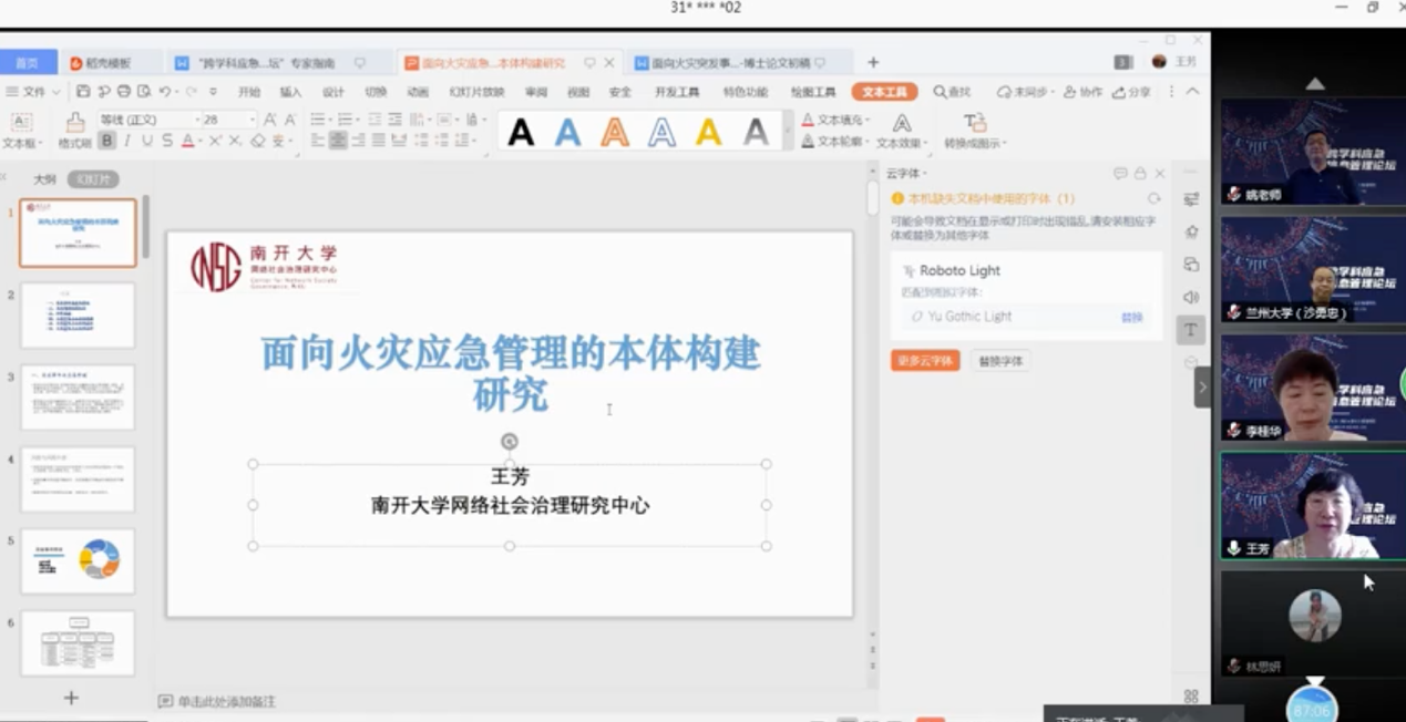 南开大学商公司网络社会治理研究中心主任王芳教授主要讲述了面向火灾应急管理的本体构建研究。她在阐释突发事件和应急管理的相关概念、本体构建的相关知识基础上,以火灾应急管理为研究对象,从确定本体的应用领域和范围、构建本体模型、定义火灾应急领域知识三个部分介绍了研究思路,并详细展示了火灾应急上位本体构建、火灾应急尚未本体实现等研究过程,最后从定性评价和定量评价两方面对火灾应急本体模型进行评价。