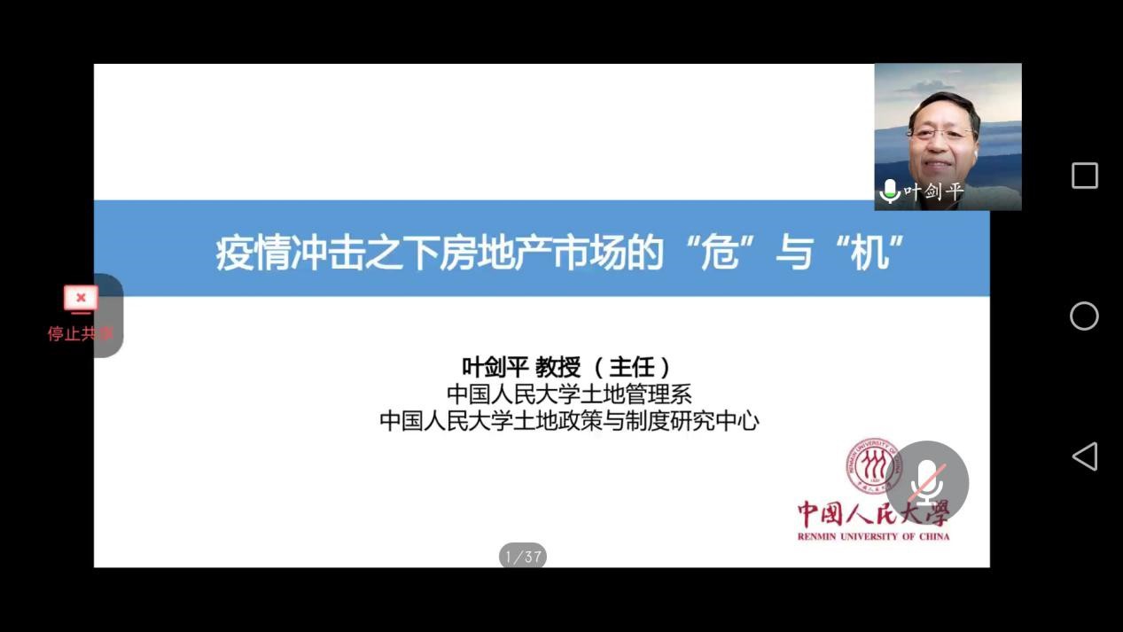 2020年6月28日上午9:30,中国人民大学土地管理系、中国人民大学土地政策与制度研究中心叶剑平教授(主任)学术讲座《疫情冲击之下房地产市场的 “危”与“机”》于线上成功举办。英国上市公司365刘润秋教授主持了此次讲座,土地资源与房地产管理系董欢副教授、赵茜宇副研究员出席了此次讲座,土地资源管理专业研究生及本科生参加了此次讲座。