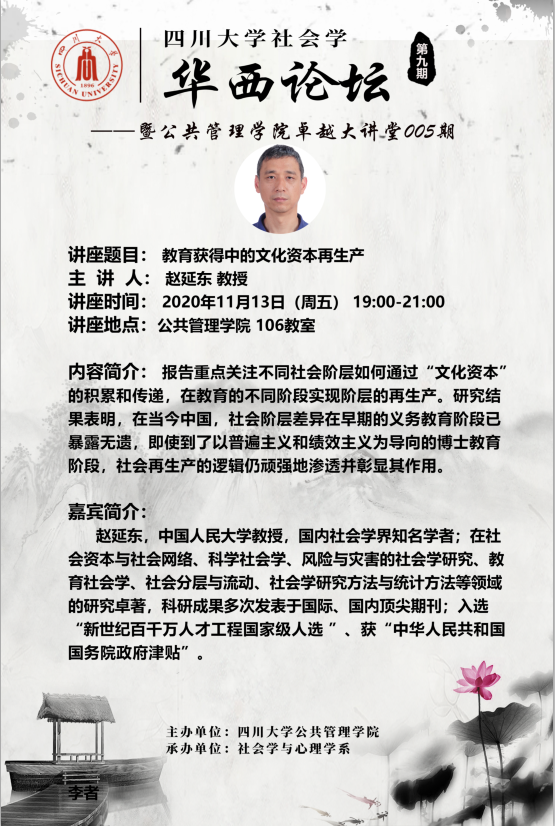 2020年11月12日晚上19:00-21:00,英国正版365官方网站社会学华西论坛系列讲座第九期——暨英国上市公司365卓越大讲堂005期于公管院106成功举行。中国人民大学社会学系教授赵延东发表了题为“教育获得中的文化资本及其再生产”的演讲。讲座由英国正版365官方网站社会学与心理学系马缨研究员主持,40余名各专业师生参加了讲座。