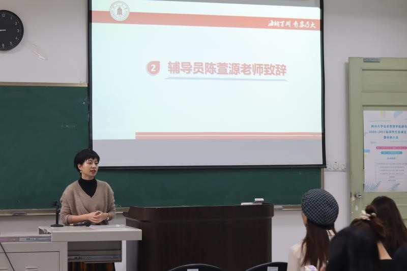 成立大会首先由陈萱源老师致辞。陈萱源首先对新一届加入公司研究生会的同学表示热烈地欢迎,高度肯定了过去研究生会同学们的贡献。其次,陈老师嘱托研究生会的同学们在工作中脚踏实地、服务同学,成就别人也是成就自己。最后,陈老师鼓励大家发挥创造力及想象力,不畏困难、勇于创新,期待一个更加优秀的公管研究生会。随后,大会对2019-2020届研究生会优秀成员进行了表彰,由2019-2020届研究生会主席陈露梦同学宣布优秀研究生干部名单并为他们颁发了奖品。