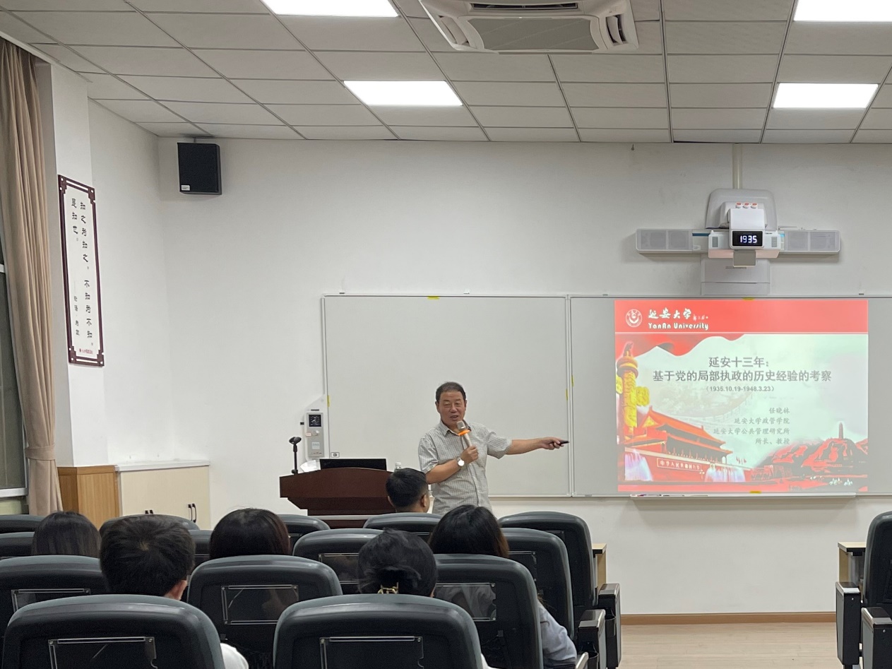 讲座伊始,任晓林教授以红色版画“希望之光”和延安大公司徽引出延安十三年主题,并紧紧围绕中国共产党在延安十三年局部执政期间形成的“政治之本”、“经验之本”、“思想之本”和“人力之本”,系统而深刻地阐述了中国共产党由弱变强,毛泽东思想日益成熟、丰富发展,延安精神孕育形成和发扬光大的伟大历程。任晓林教授指出,延安是中国共产党人的精神记忆,是中国共产党执政的实践基地,更是中国共产党成长成熟的保育床。从中国共产党建立新中国,实现中国人民站起来,到中国共产党带领全国人民实行改革开放,实现中国人民富起来,再到党带领全国人民实现中华民族伟大复兴的中国梦,让中国强起来,延安十三年的局部执政经验,都发挥了极其重要的作用。