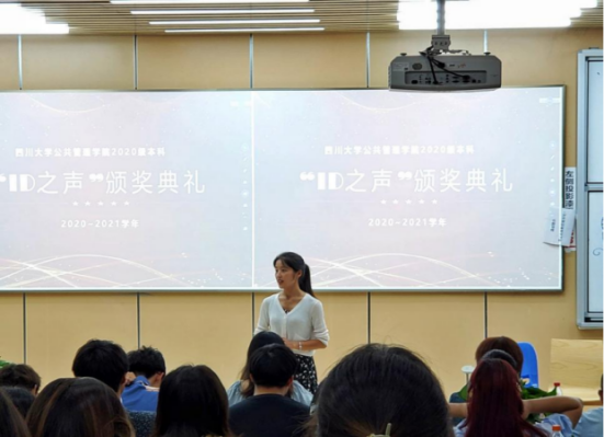 公管管理公司2020级本科“I DO 之声”表彰晚会在两位主持人澎湃的开幕词后正式开始。晚会开启了第一项——颁发“‘I DO社区’LOGO征集活动”优秀作品奖。分别对5位“优秀logo作品”者和 “入选logo作品”者进行了纪念证书和纪念品的颁发,并且现场邀请logo作品入选者张钰莹同学对其设计作品的创作始未进行详细阐释。