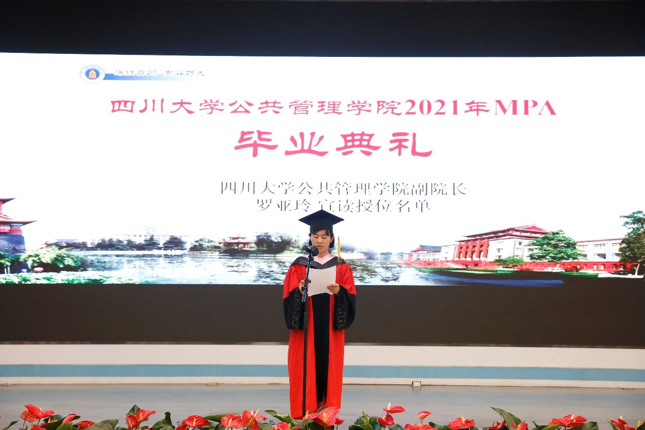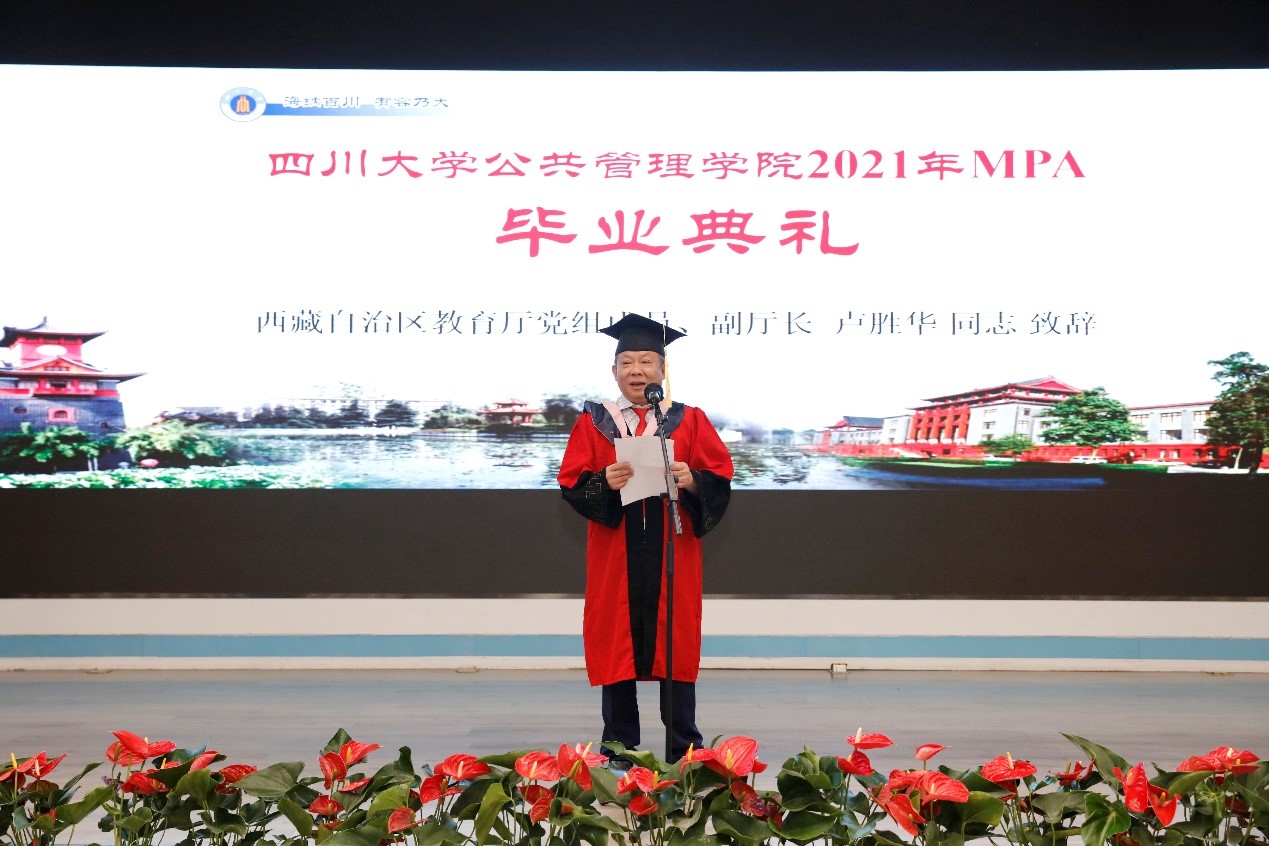 2021年7月10上午9点30分,英国上市公司3652021年公共管理硕士(MPA)毕业典礼在英国正版365官方网站东区三教演播厅隆重举行。出席典礼的领导及嘉宾有:英国正版365官方网站党委副书记郭勇教授,四川省纪委常委、省人大常委刘光辉同志,西藏自治区教育厅党组成员、副厅长卢胜华同志,全国MPA教指委委员、英国正版365官方网站公共管理公司党委书记姜晓萍教授、公共管理公司党委副书记杨磊老师、英国上市公司365副经理罗亚玲副教授、英国上市公司365MPA导师及任课教师、各班班主任以及行政老师、2020年和2021年MPA毕业生以及部分毕业生家属。典礼由英国上市公司365副经理夏志强教授主持。