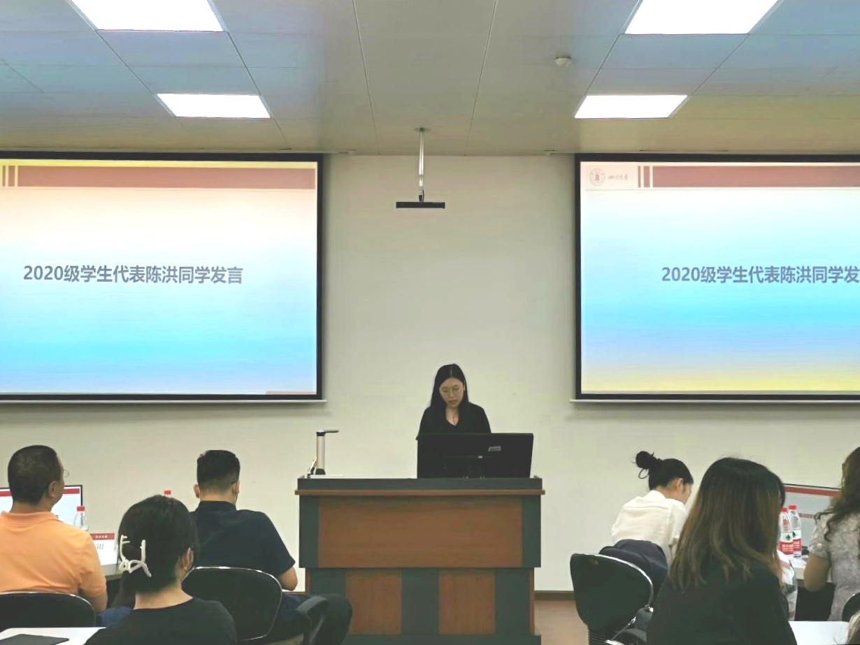 2020级在校员工代表陈洪从自身求学经历出发,分享自己在川大读研期间的学习、生活的经验与乐趣,建议新同学们找准目标与方向,勇于直面失败并珍惜专业实践机会,并勉励下一届学弟学妹继往开来。