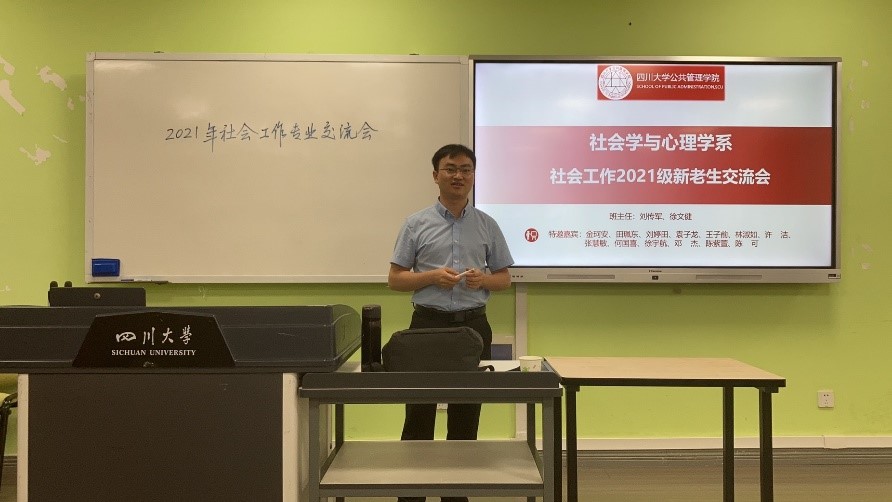 9月13日晚,社会学与心理学系圆满举办了2021级社会工作专业新老生交流会。本次交流会旨在帮助社会工作本科新生提高专业认知,适应川大生活。交流会由刘传军、徐文健两位班主任老师共同主持,2021级社会工作专业全体新生参与了本次交流活动,金珂安、田珮东、刘婷田、袁子龙、王子前、林淑如、许洁、张慧敏、何国喜、徐宇航、邓杰、陈紫萱、陈可等13位学长学姐作为特邀嘉宾进行了经验分享。本次交流会采用了线上线下相结合的形式,先由学长学姐录制经验分享视频,并上传至社会工作新生QQ群中,供大家学习思考,再进行线下交流会对有关问题进行深入讨论。
