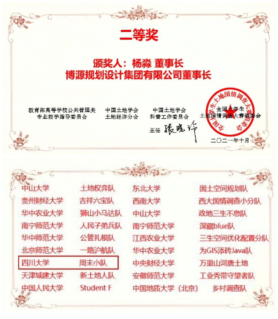 在赵茜宇副教授、唐鹏副教授的指导以及特聘副研究员饶永恒等土管系老师的支持下,由公司土管系2019级本科生廖珊、黄思睿、于新月、李佳怡组成的队伍,完成《公园城市乡村表达的综合效益评价——以成都市郫都区为例》调查报告,经过激烈的竞争进入决赛,并通过现场汇报和答辩中的优异表现,获得“二等奖”的荣誉。此外,由公司土管系2019级本科生曹懿璇、谢博宇、陈烨、刘昊、肖子帆组成的队伍也凭借《同城化发展背景下,“成德眉资”国土空间利用效率评价》调查报告,探讨同城化的背景下成德眉资国土空间利用效率及协同程度,荣获“优秀作品奖”。