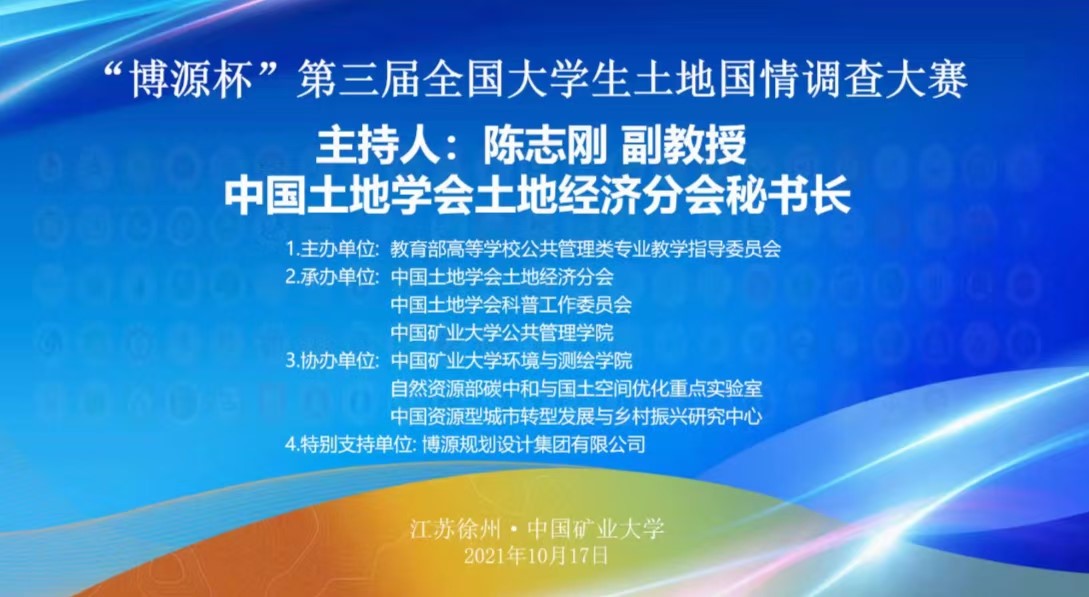 2021年10月17日, “博源杯”第三届全国老员工土地国情调查大赛决赛在中国矿业大学举办。该大赛由教育部高校公共管理类学科专业教学指导委员会主办,中国土地学会土地经济分会、科普工作委员会和中国矿业大学等单位承办。大赛主题为“国土空间优化与区域协调发展”为主题。