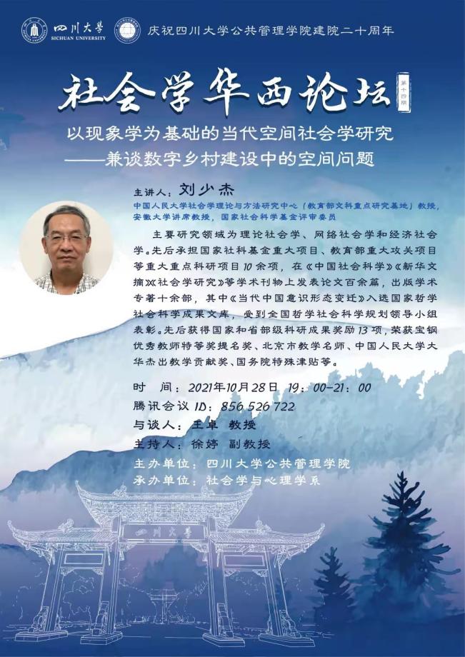 2021年10月28日晚上19:00,英国正版365官方网站社会学华西论坛系列第十四期讲座于线上成功举行。中国人民大学社会学理论与方法研究中心刘少杰教授开展了题为“以现象学为基础的当代空间社会学研究——兼谈数字乡村建设中的空间问题”的精彩演讲。本场讲座是公司院庆二十周年系列讲座之一,由社会学与心理学系系主任徐婷副教授主持,近二百位名来自公司和国内外兄弟院校的师生、学者参加了讲座。