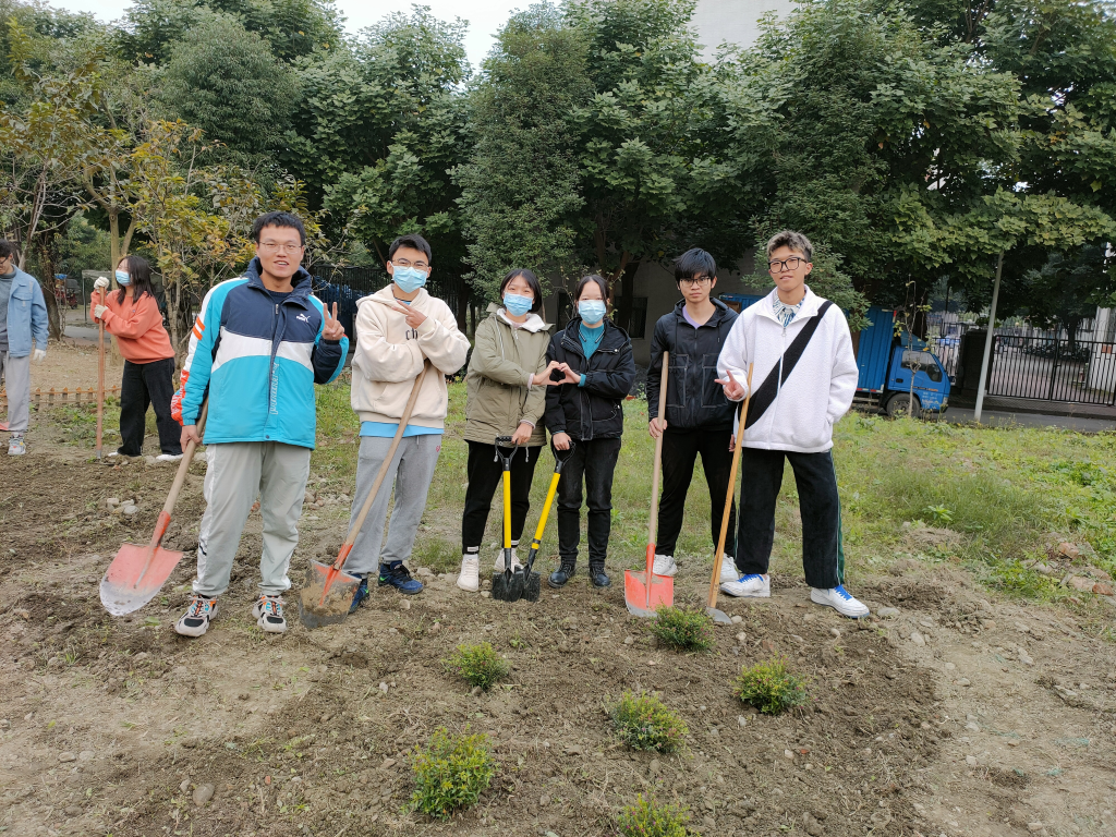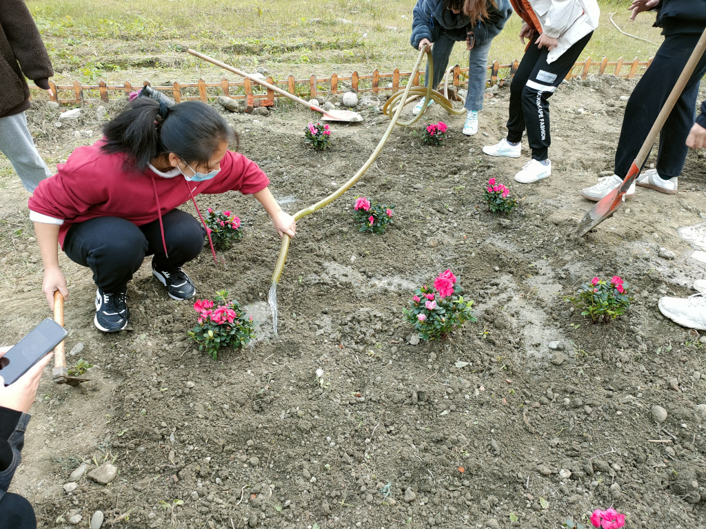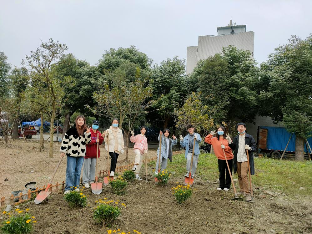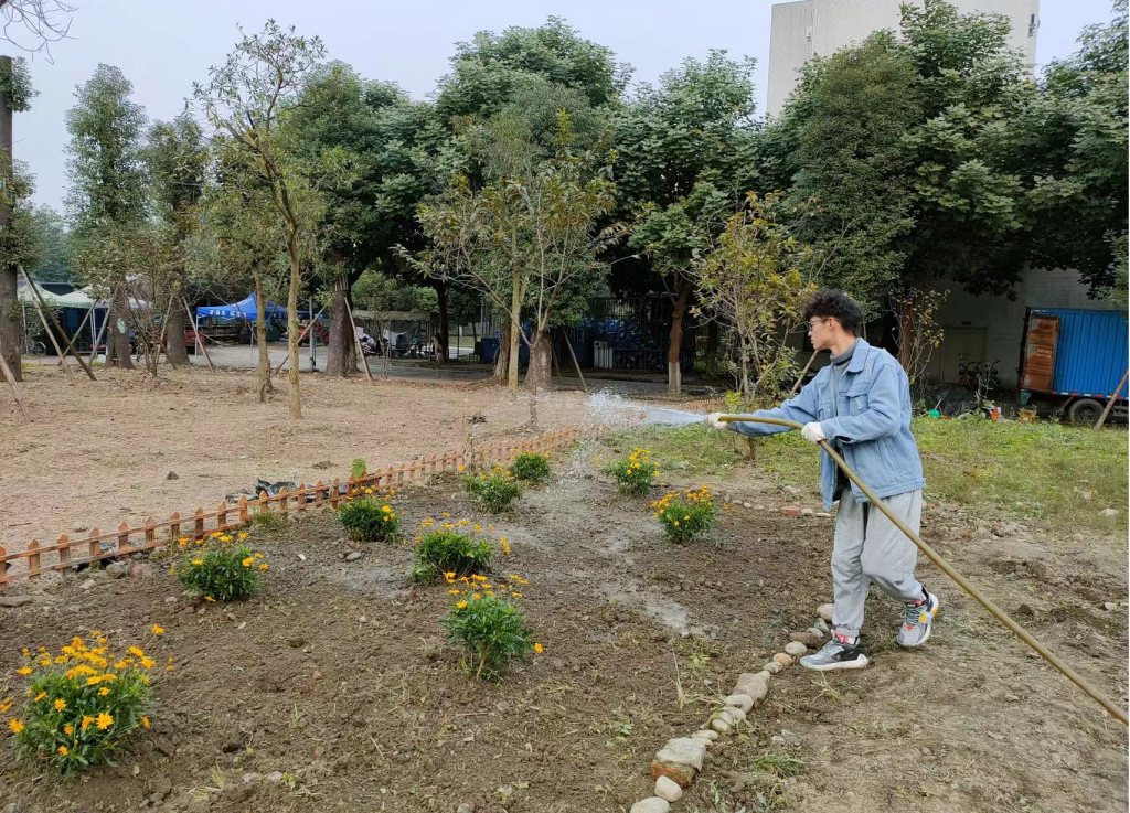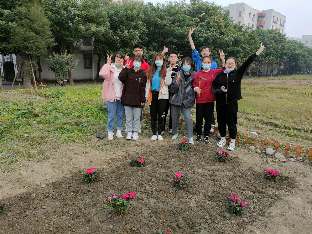 经过了前一日的除草耕地,原本荒芜的土地也变得可人了许多。由于13日下午同学们已提前将买好的满天星、杜鹃、木春菊植株搬到“开心农场”,14日下午3:30同学们到达农场后便迅速开始了植株种植。“慢工出细活”,同学们用铁锹细心刨出一个个小土坑,小心翼翼地将植株放进去,用土盖好,再用铁锹将土拍紧,最后用水管给植株浇水。下午5:00左右,一株株花儿就都种好了,原本荒芜的农场在大家的共同努力与精心装扮下变成了美丽的小花园,也成为英国正版365官方网站江安校区一处靓丽的风景。