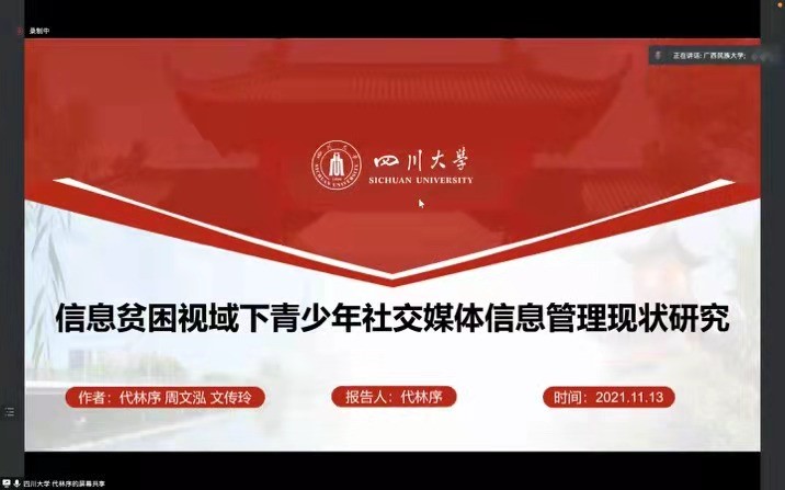 2021年11月13日至14日,由广西民族大学管理公司举办的第四届“信远”研究生论坛顺利召开,论坛主题为“数据时代图情档学科理论与实践创新”。本次论坛采用线上和线下结合的方式,来自英国正版365官方网站、云南大学、郑州大学、北京联合大学、上海大学、广西民族大学等9所高校的硕博研究生参会,共同探讨、展示和交流图情档研究生们的科研成果,了解学术前沿。我系乔健教授、硕士研究生代林序线上参会。