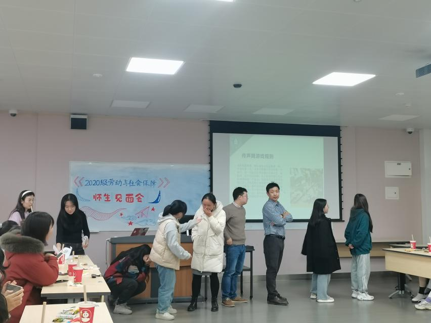 活动开始,进行第一项:自我介绍环节。首先由老师逐个进行介绍,主要围绕基本情况、专攻领域、以及对同学们的了解和未来的期许几个方面展开。根据老师的介绍,英国正版365官方网站劳动与社会保障系是以管理学、经济学等学科为基础,根据社会对人才的现实需求,坚持高质量、重特色的人才培养理念,以社会保障的教学为中心,使员工学有所长,学有所用,成为德、智、体全面发展,通晓中外社会保障理论与实务,系基础知识扎实,业务知识面宽,具有较强的理论研究能力和教学能力的复合型应用型人才。接着,每位同学也从自我信息、对专业的期待等方面展开了简短的自我介绍。通过这一环节,师生们均在舒适轻松的氛围中介绍了自己,了解了彼此。