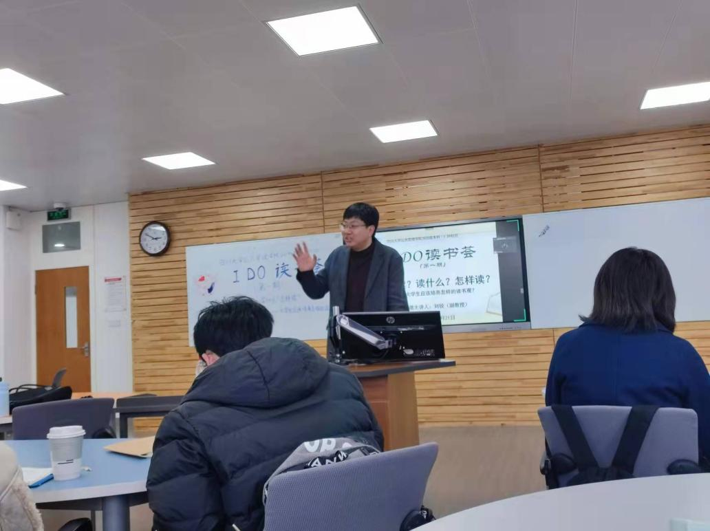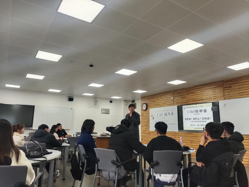 “I DO读书荟”伊始,苟欢老师首先介绍了IDO读书荟成立的意义、目的以及之后的运行模式,随后,第一期“I DO读书荟”采取特邀嘉宾主题分享-同学自主提问的形式正式进行。刘锐老师紧密结合老员工读书的功用、内容和方法,向同学们分享了“老员工应该拥有怎样的读书观”这一核心问题。