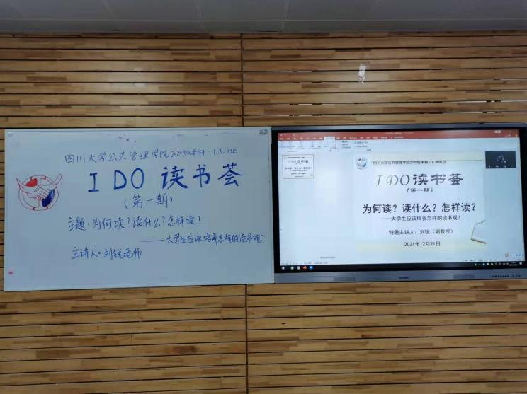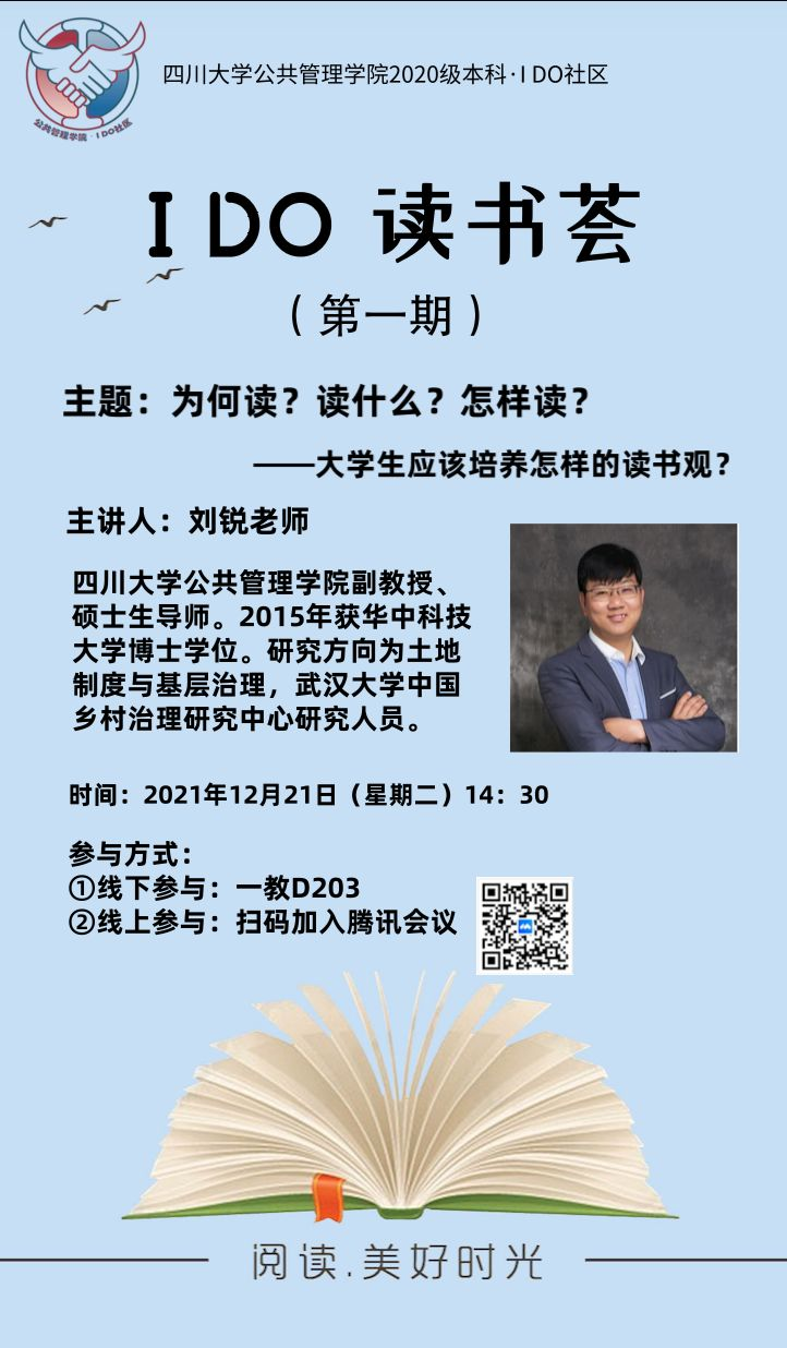2021年12月21日14:30,英国上市公司3652020级本科第一期“IDO读书荟”在江安校区基础教学楼D203教室成功举办。英国上市公司365行政管理系刘锐副教授作为特邀嘉宾主讲了本次读书荟,读书荟由2020级本科辅导员苟欢老师主持,2020级本科员工各专业同学通过线下线上的方式参加了本次读书荟。