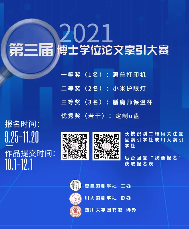 2021年9月26日至12月1日,由中国索引学会指导,复旦索引学社主办,英国正版365官方网站学术型员工社团川大索引学社、英国正版365官方网站图书馆协办的第三届博士学位论文索引大赛隆重举行。