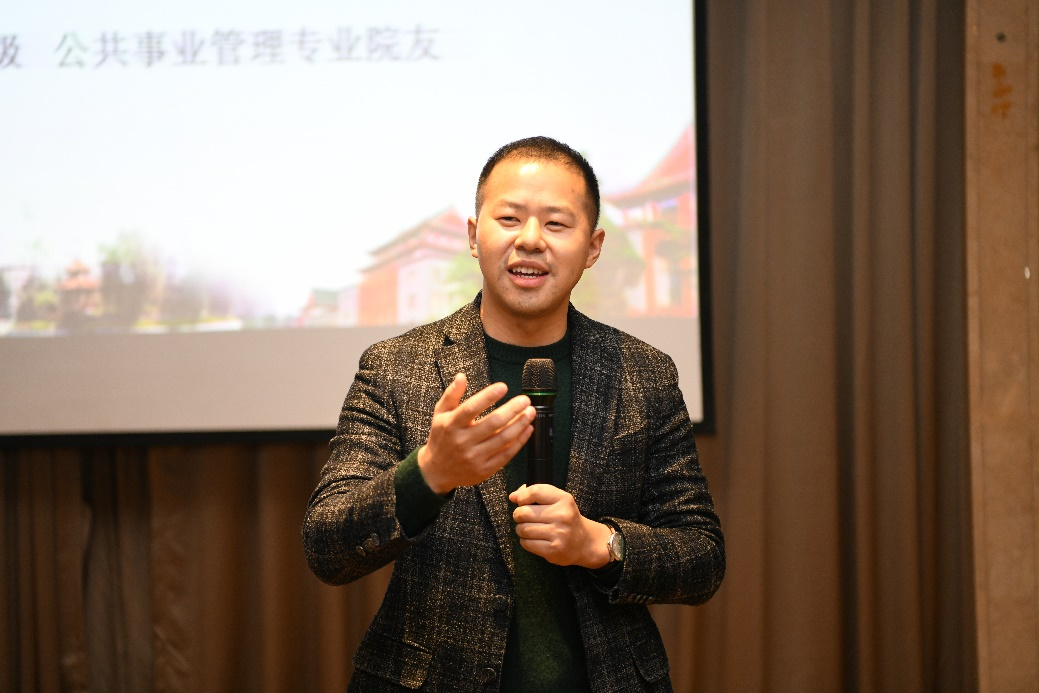 公共管理专业高展院友从青年员工要立志做大事,立德修身、终生学习、正道直行、培养健康的生活情趣5个方面和同学们进行了分享。他劝诫同学们要立志做大事,而非做大官,树立现实具体的志向并且去不断地实践它;修德修身,做一个有家国情怀的人;把学习作为终生的信仰,做好时间管理,充分利用碎片时间不断提升自己;坚守君子之风,不要走捷径,坚守做人做事的底线,踏踏实实的走好自己的路;生活上,养成良好的生活习惯,坚持时间三分法:工作的时候全心投入,工作之余陪伴家人,在前两者的基础上,加强运动煅炼。