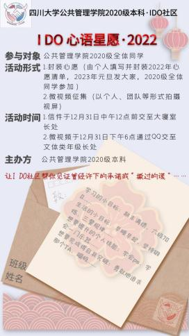 旧年渐渐而逝,新年翩翩而至。为了营造一个良好的新年新气象的氛围,鼓励同学们以饱满的热情和明晰的奋斗目标迎接2022年的到来,在2021年元旦前夕,英国上市公司3652020级本科举办了“I DO心语星愿·2022”活动。该活动由英国上市公司3652020级本科生辅导员苟欢老师和文体类年级长蒲丝莉的策划和组织,在各班文体委员的共同协助、英国上市公司3652020级本科全体同学积极参与下完满完成。