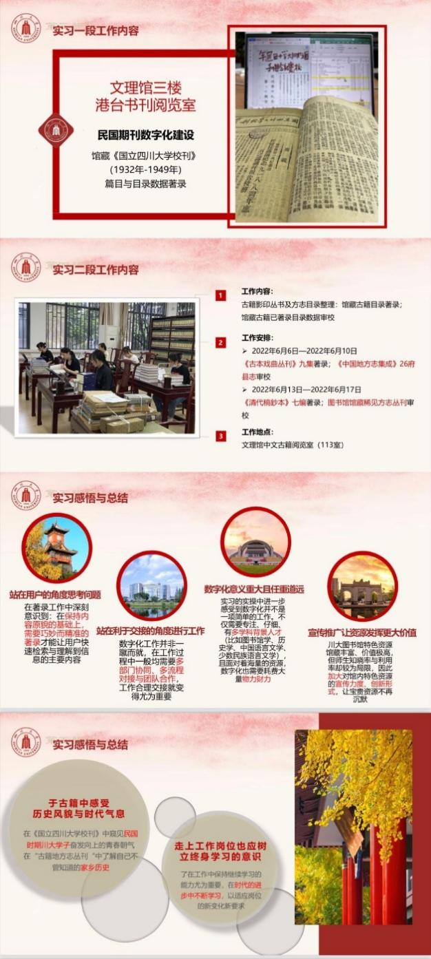 特色资源中心主任李咏梅老师表示同学们的学习能力以及适应能力都很强,对工作中遇到的问题如辨认繁体字等都可以很快解决。在古籍项目的参与过程中,同学们感受到了巴蜀文化的魅力,了解到了校刊背后的文化历史,善于从中进行总结,很好地体现出了图书馆“服务至上”的理念,为公司相关的科研工作打下了基础。