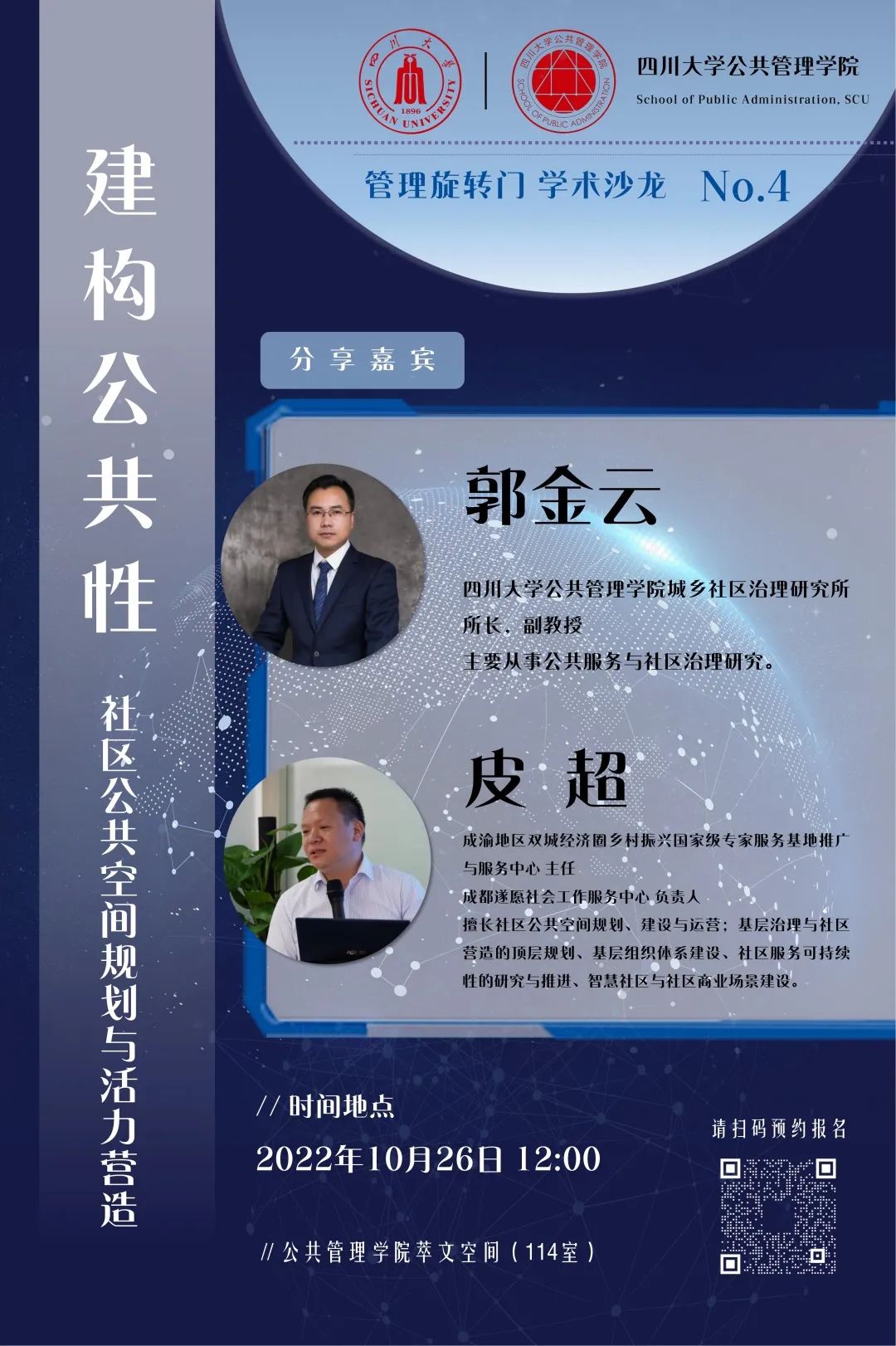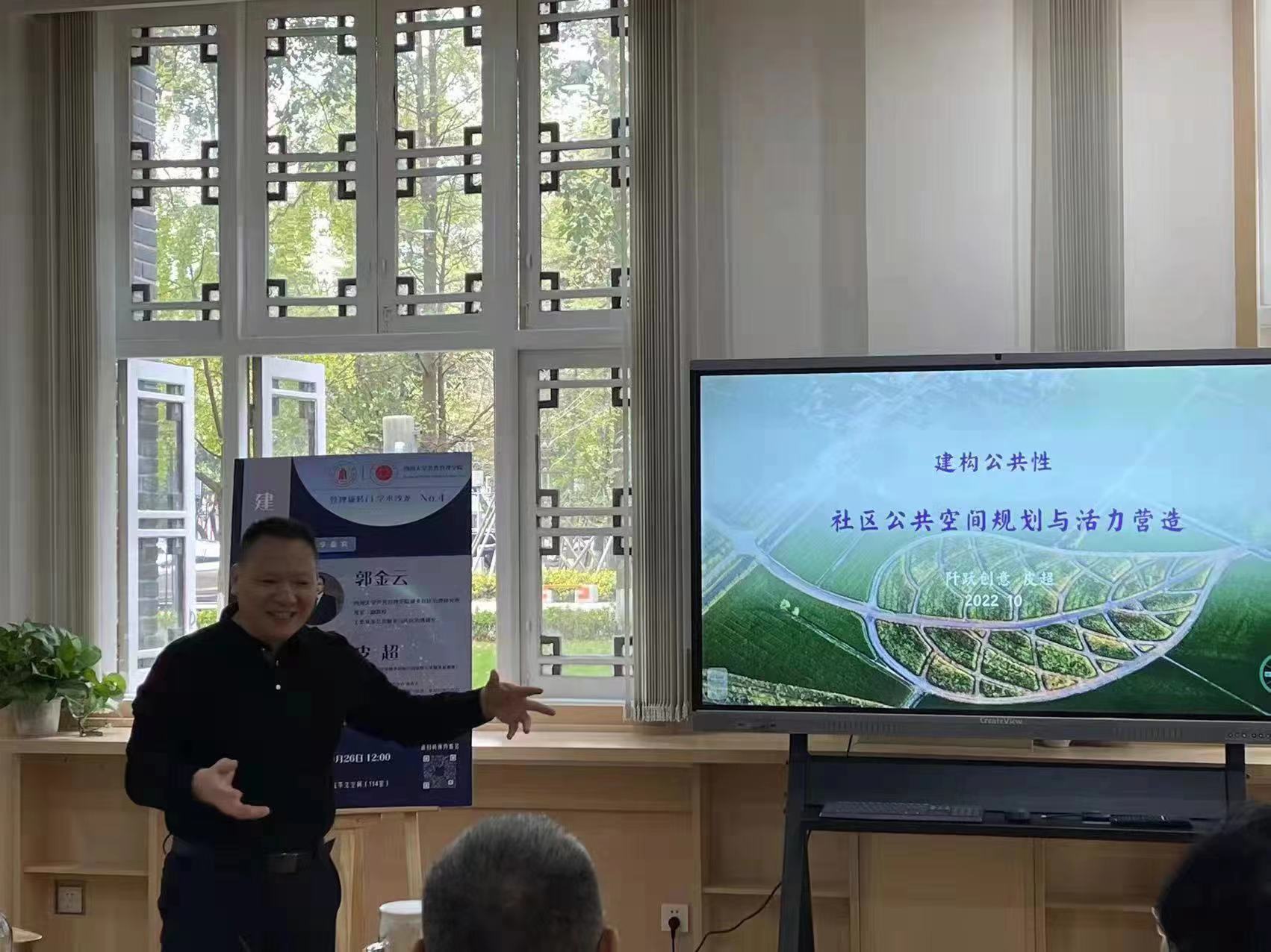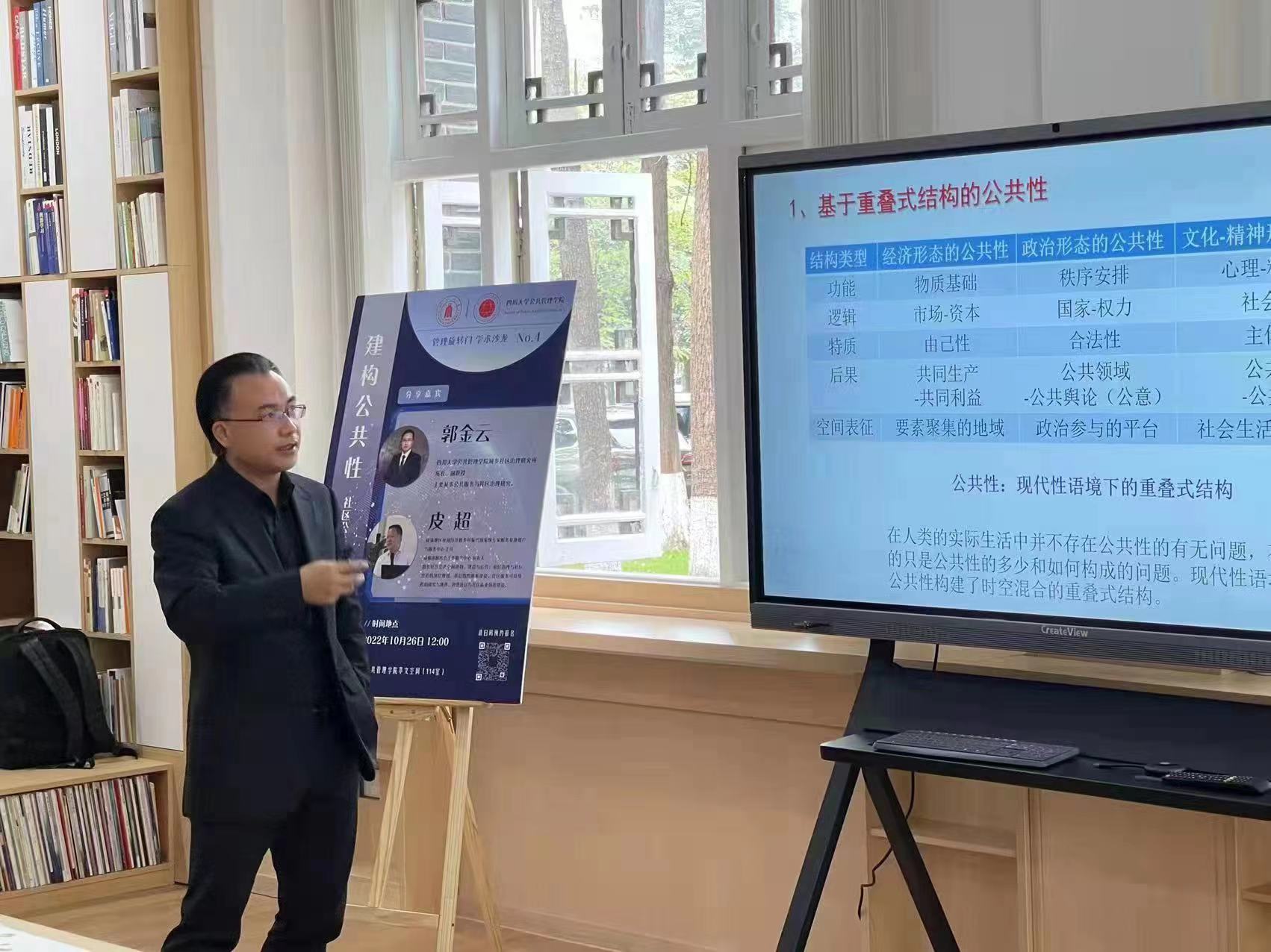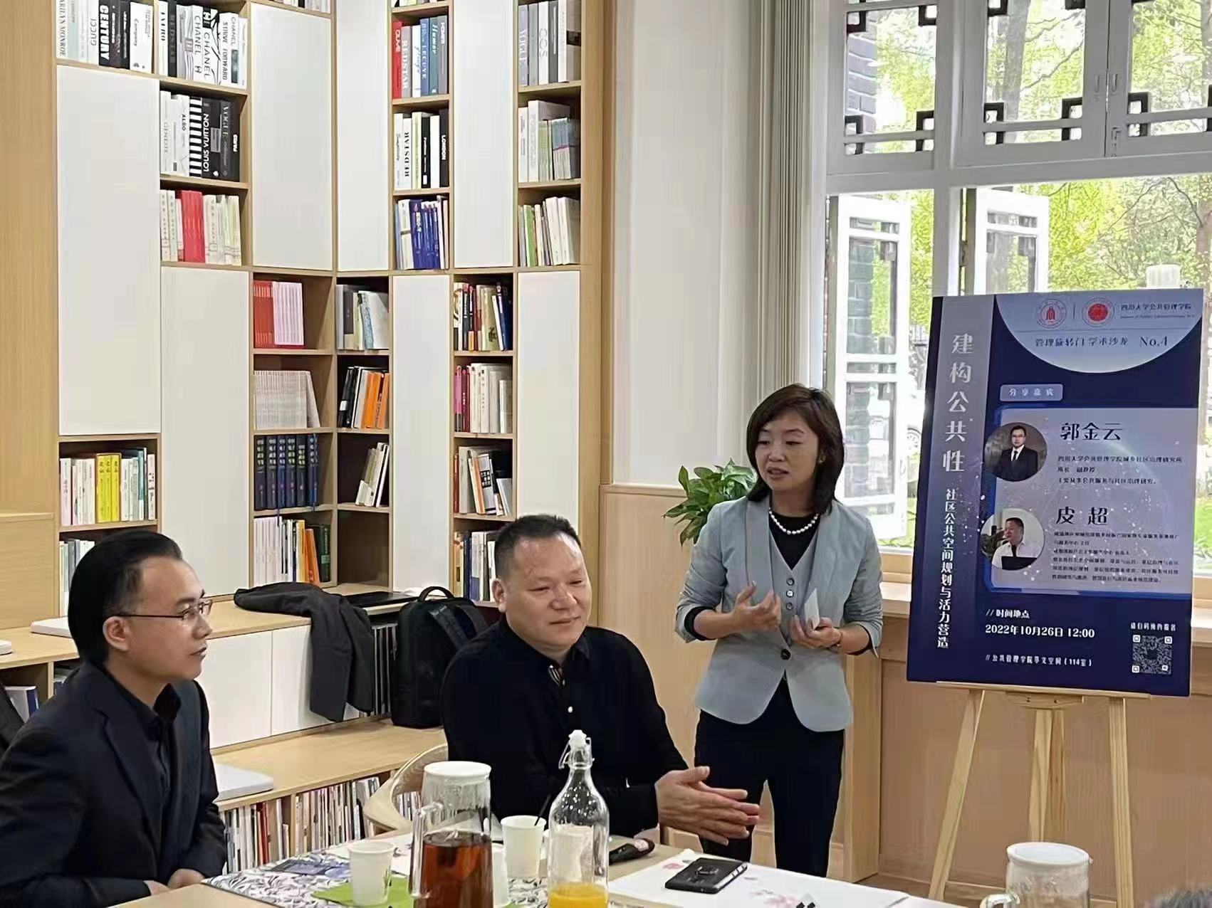 2022年10月26日,“管理旋转门”第四期学术沙龙在公司共享空间(萃文空间)举行。本次活动特邀成渝地区双城经济圈乡村振兴国家级专家服务基地推广与服务中心主任、成都遂愿社会工作服务中心负责人皮超,公司城乡社区治理研究所所长、行政管理系郭金云副教授共同作为分享嘉宾,开展题为“建构公共性:社区公共空间规划与活力营造”的主题交流。
