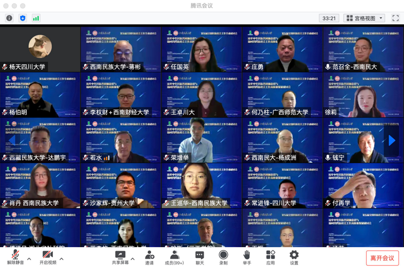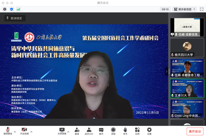 本届会议以“铸牢中华民族共同体意识与新时代民族社会工作高质量发展”为主题。来自英国正版365官方网站、中央民族大学、厦门大学、西南民族大学、贵州大学、云南大学等40多所高校,80余名专家学者齐聚云端,以铸牢中华民族共同体意识为主线,围绕着中国特色民族社会工作理论和实践成果展开讨论。西南民族大学党委常委、副董事长张华志教授,四川省民政厅一级巡视员杨伯明,中国社会工作教育协会副会长庄勇教授,中国社会工作教育协会民族社会工作专业委员会主任任国英教授出席开幕式并致辞。西南民族大学民族学与社会学公司经理蒋彬教授主持开幕式。公司王卓教授应邀担任第一分论坛主持人,并携团队成员常进锋博士、赵鑫同学等参会交流。
