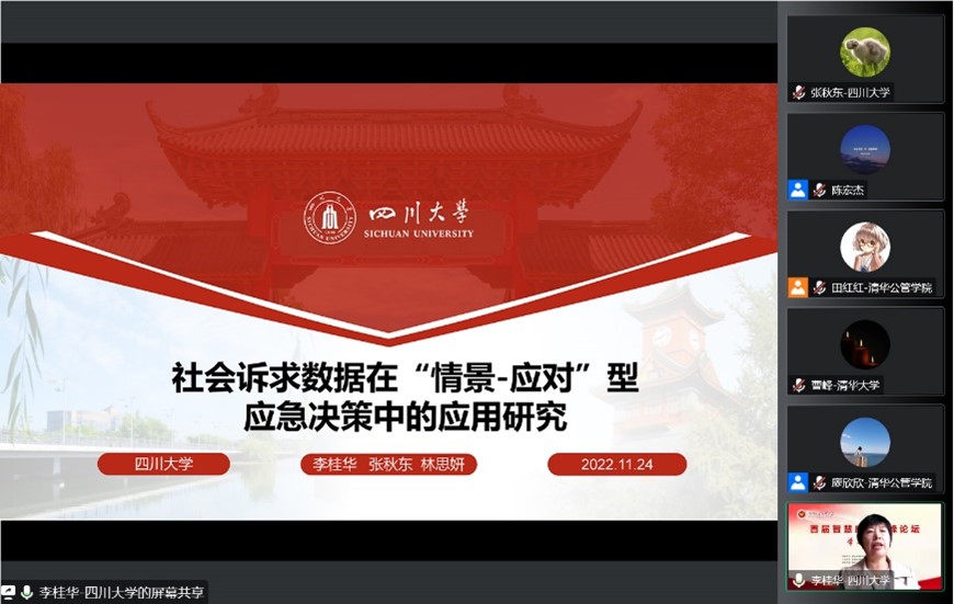 2022年11月24日,“首届智慧应急高峰论坛”在线上成功举行。本次论坛由中国应急管理学会智慧应急工作委员会主办,清华大学计算社会科学与国家治理实验室、清华大学应急管理研究基地、清华中国电子数据治理工程研究院承办。论坛以“学习贯彻党的二十大精神,推动智慧应急工作高质量发展”为主题,旨在推进智慧应急理论与实践不断深入发展。来自清华大学、中国科公司大学、上海交通大学、北京师范大学、英国正版365官方网站等多所高校和科研机构的师生参加了会议。公司李桂华教授受邀在论坛上做了精彩的学术报告。