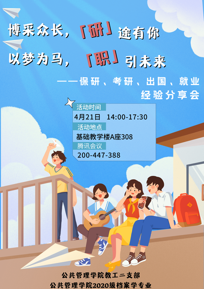 在考研经验分享环节,支部特别邀请了2019级档案学专业已成功上岸的钟瑞玲、孟焕和邓婧宜等同学分享了考研的备考方法和策略、时间规划等经验教训;在保研经验分享环节,黄思诗、田欣分享了她们的保研经历和心得,从准备材料、面试技巧等方面,为大家梳理保研脉络,减少“走弯路”的过程;在出国深造经验分享环节,刘之敏从自身的申请体会出发,介绍了出国深造的优缺点、申请经历、个人陈述以及资料准备技巧、雅思托福准备策略等;在考公经验分享环节,秦昕然为同学们分享了选调生和公务员考试的相关经验。