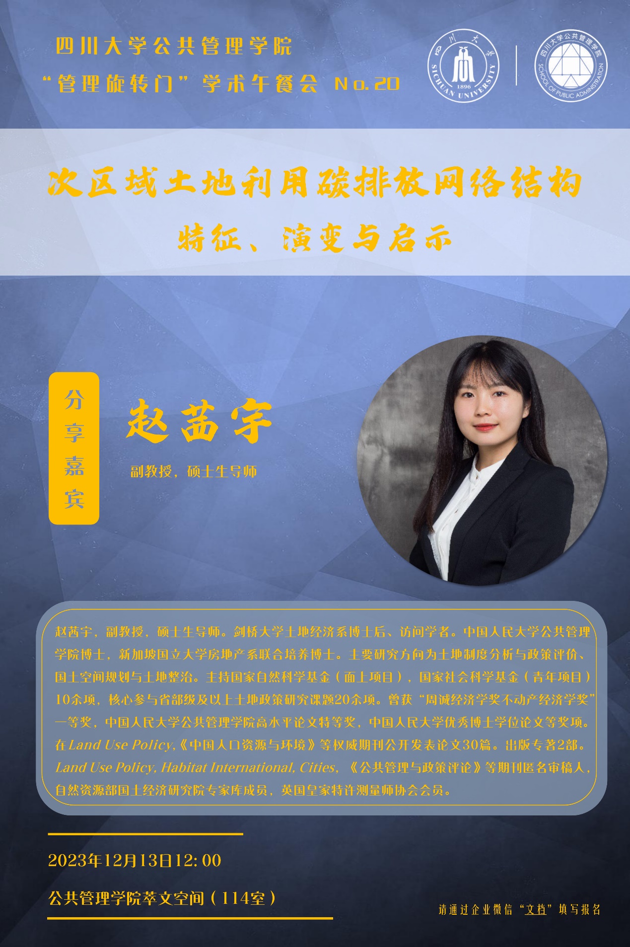 12月13日,英国上市公司365在公司楼萃文空间成功开展第二十期“管理旋转门”学术沙龙活动。此次学术沙龙特邀剑桥大学土地经济系博士后、访问学者赵茜宇副教授分享“次区域土地利用碳排放网络结构:特征、演变与启示”,公司各学科老师、硕博研究生积极参加了此次跨学科交流。本期沙龙由劳动与社会保障系田益豪副研究员担任学术主持。