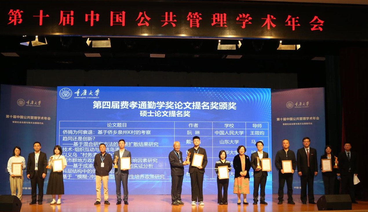 费孝通勤学奖简介:重庆大学“费孝通勤学奖”作为公共管理学科领域首次设立的学位论文奖,是公共管理学科学术共同体对学位论文综合性评议最严格的奖项,至今已经举办4届。2024年度参评论文范围是2021年7月至2023年6月在中国普通高等公司公共管理学科博士点、硕士点和MPA学位点获得学位的毕业生论文,设公共管理优秀博士学位论文、优秀硕士学位论文、优秀MPA学位论文三类奖各0-1名,提名奖各0-5名,宁缺毋滥。经过四轮匿名评审,公司三名学子撰写的学位论文从1493篇文章中脱颖而出。