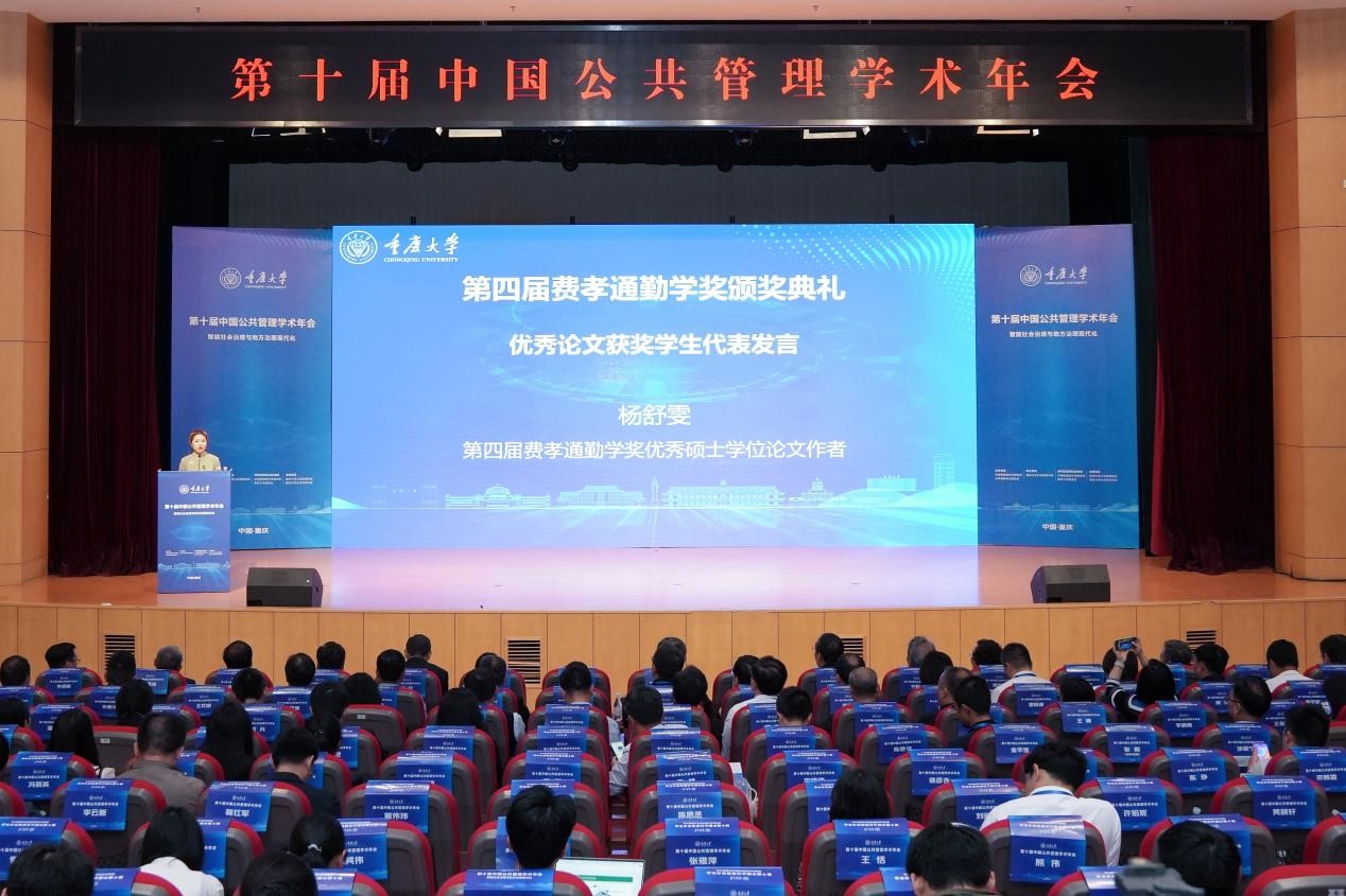 杨舒雯同学作为获奖员工代表在颁奖典礼上发言并表达了扎根田野的学术志愿。她表示作为公管学子,一定努力传承费孝通先生和前辈们的治学态度,继续向下扎根,用心、用文字、用真情把论文写在祖国大地上,讲好中国故事,传播好中国声音。
