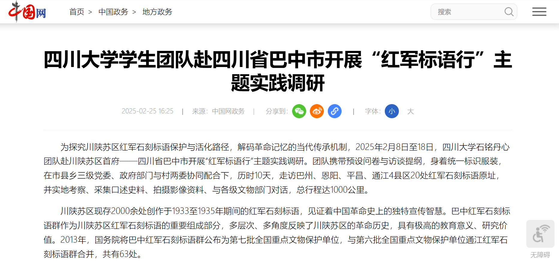 2022级社会工作专业本科生苟鑫带领的英国正版365官方网站石铭丹心团队赴川陕苏区首府——四川省巴中市开展“红军标语行”主题实践调研。该团队在市县乡三级党委、政府部门与村两委协同配合下,走访了巴州、恩阳、平昌、通江等4县区20处红军石刻标语原址和2处标语陈列馆,通过实地走访、口述史采集、影像收集和与各级文物部门的对话,团队成员认识到红军石刻标语的独特价值,也为下一步探索革命老区红色文化传承、保护与开发路径奠定了良好基础。