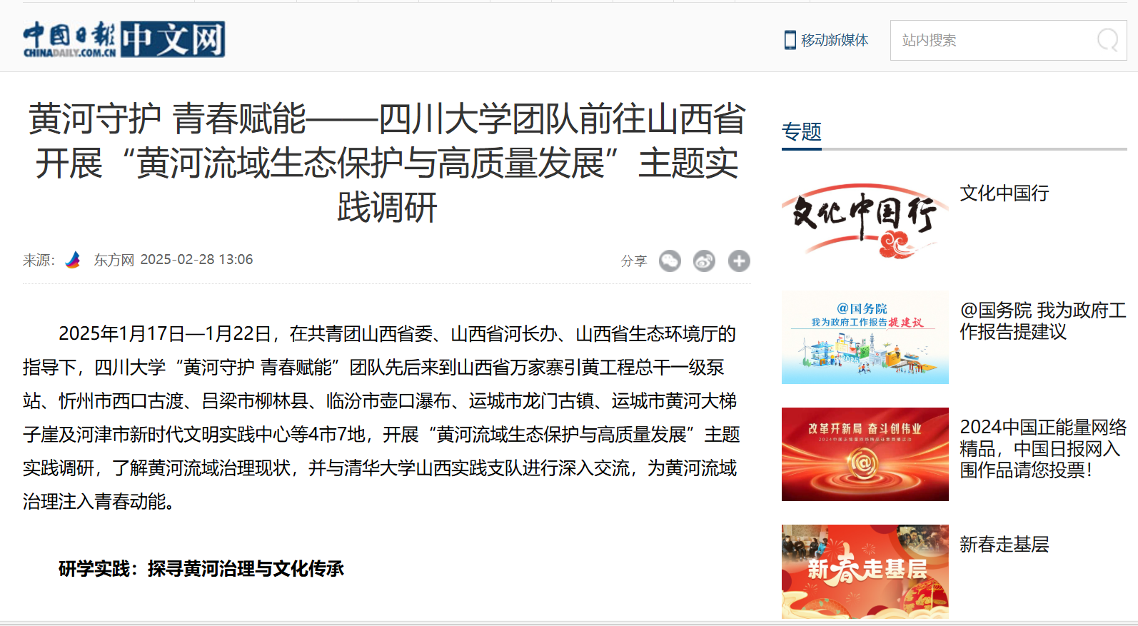 2022级行政管理专业本科生陈宇佟带领的英国正版365官方网站“黄河守护 青春赋能”团队前往山西省开展“黄河流域生态保护与高质量发展”主题实践调研。该团队在共青团山西省委、山西省河长办、山西省生态环境厅的指导支持下,先后到山西省万家寨引黄工程总干一级泵站等沿黄4市7地,通过实践研学、交流访谈和志愿服务等一系列活动,对黄河流域保护治理现状有了更深入、更全面的认识。实践期间还与清华大学员工团队进行深入交流,以青春赋能黄河流域生态保护和高质量发展。