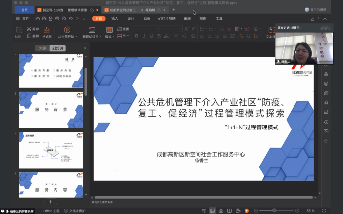 此次讲座特邀成都新空间公益服务中心党支部书记、副总干事兼社区发展事业群杨香兰总监主讲。杨香兰女士先后执行过青少年社会教育、社区发展服务、非公党建服务等领域的项目,所负责项目获得共青团中央、民政部、中国志愿服务联合会联合授予的首届中国青年志愿服务项目大赛金奖,主持、协助研发和修订了《党建社工工作服务指南》、《商务楼宇党建服务指南》、《社区公共空间运营手册》、《社区记忆馆建设及运营指南》等多份服务手册,具有深厚的理论功底和丰富的实践经验。她的讲座题目是“公共危机管理下介入产业社区‘ 防疫、复工、促经济’过程管理模式探索”。