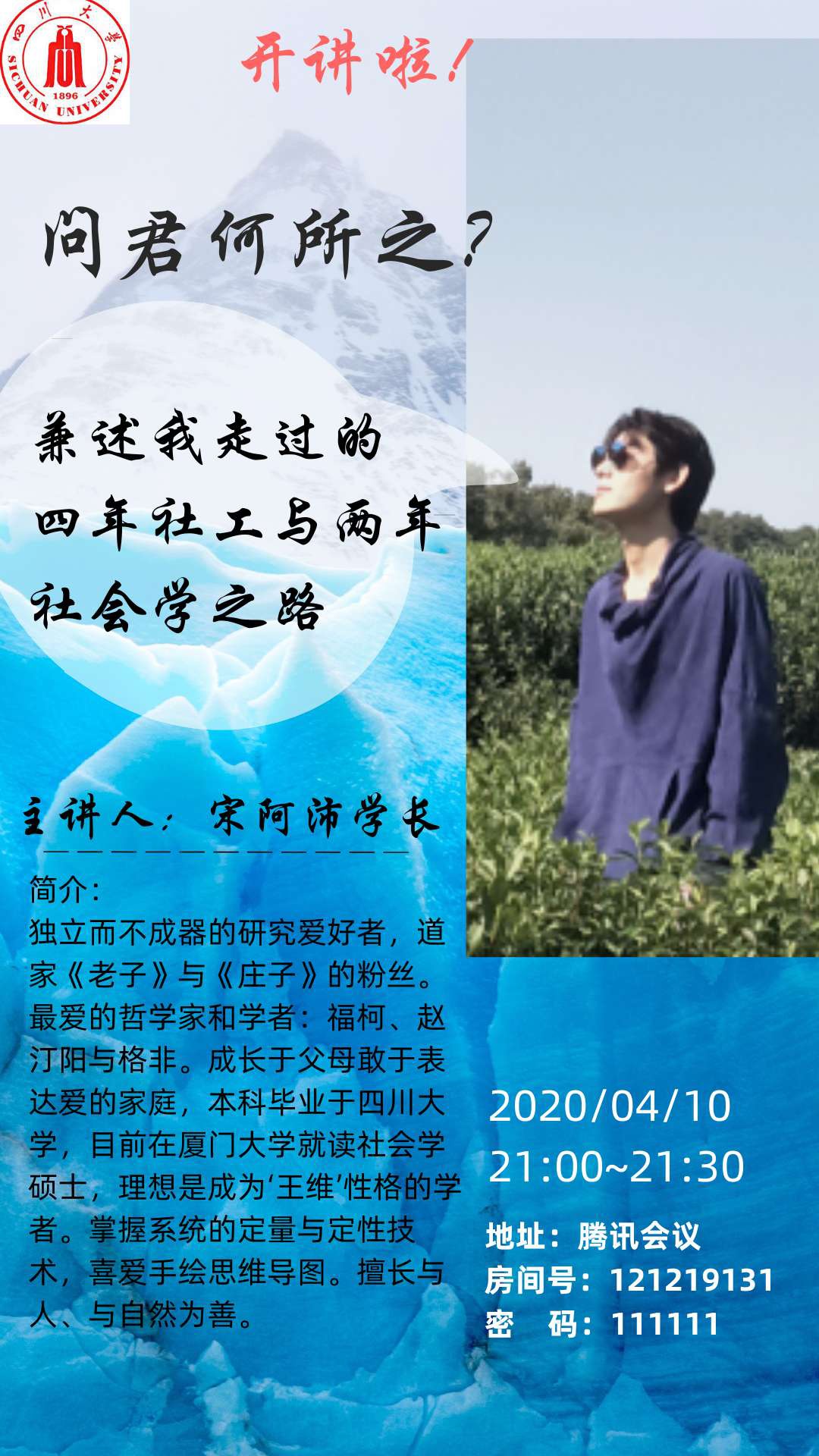 2020年4月10日晚8:00,社会学与心理学系张琪老师与两位社会工作专业培养的优秀毕业生李博超、宋阿沛线上为大一、大三的同学进行了一场别开生面的交流会,为学弟学妹们拨开专业迷雾。
