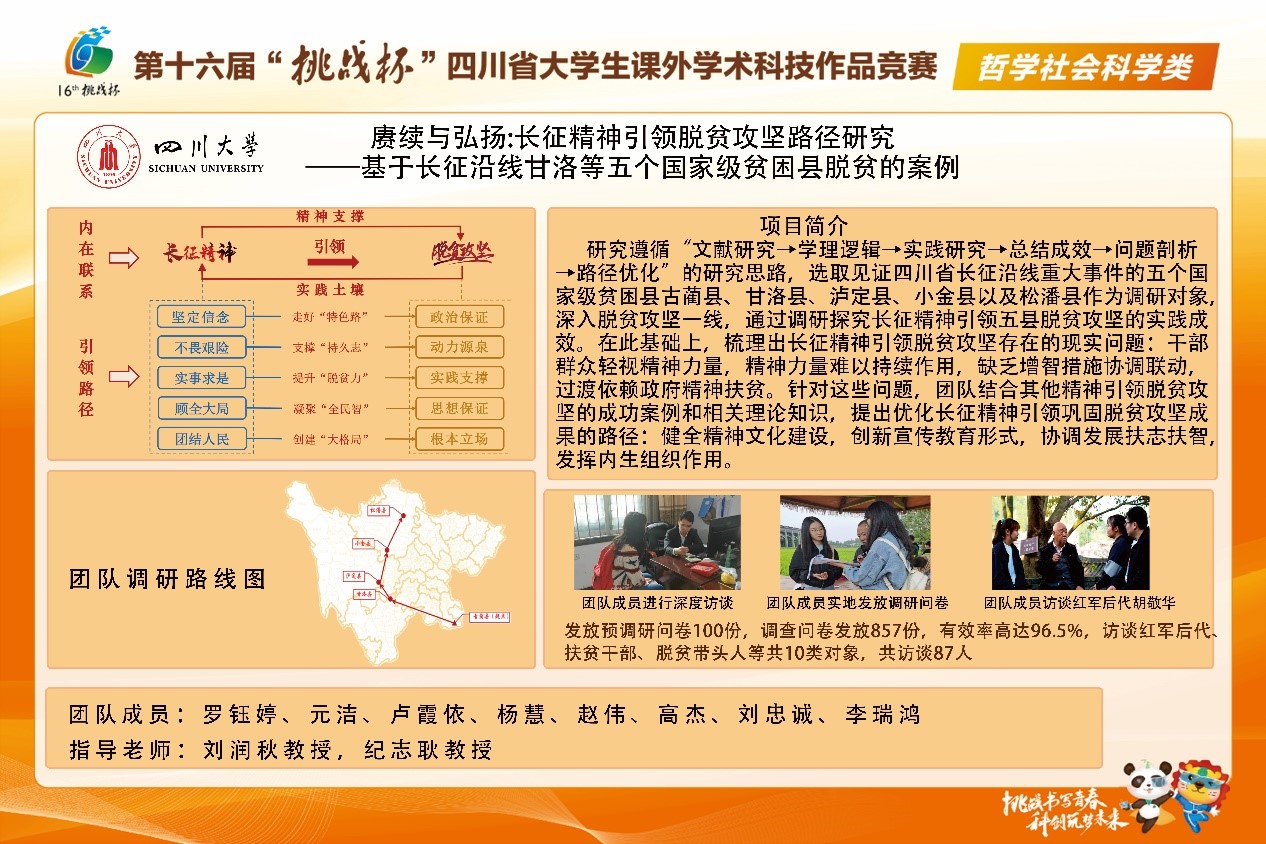 2021年5月22日-24日,由共青团四川省委、四川省委组织部、四川省科协、省教育厅、省社科院、省科技厅、省人力资源社会保障厅和省学联联合主办的第十六届“挑战杯”四川省老员工课外学术科技作品竞赛线下终审决赛在四川师范大学举行。全省共91所高校、近10万名青年员工参与,网报参赛作品13000余件。经过网络初评、线下问辩、专家讨论等环节,大赛最终评选出一等奖作品80件、二等奖作品160件、三等奖作品560件。公司土地资源管理系刘润秋教授指导的作品《赓续与弘扬:长征精神引领脱贫攻坚路径研究——基于长征沿线甘洛等五个国家级贫困县脱贫的案例》喜获一等奖。