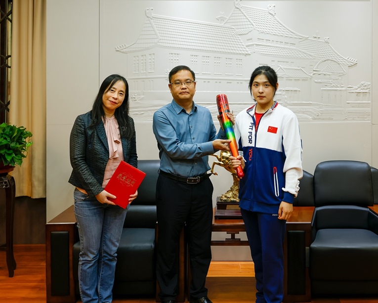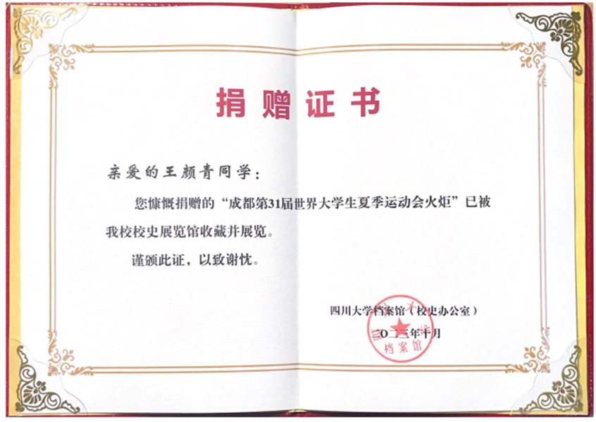 王颜青同学表示,能够以火炬手的身份参与成都第31届大运会是她的荣幸,这次把大运会开幕式火炬捐赠给公司,一方面想表达自己对公司培养的感激,另一方面也希望能激励更多川大人点燃青春梦想,彰显青春担当。