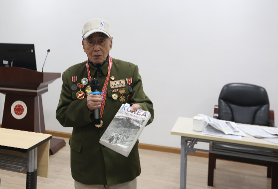 上午9:30,伴着热烈的掌声,身着军装与军功章的抗美援朝战争亲历者——今年90高龄的莫若健老先生迈着坚定的步伐走进教室,站定并向大家敬礼。莫老先生从抗美援朝第一次战役起,历任敌工组副组长、英语翻译、敌工干事、志愿军政治部俘虏管理处助理员、总政英语研究班学员、志愿军参谋公司学员、志愿军速成中学教员等职,1953年被朝鲜政府授予军功章一枚,1956年被哈尔滨市政府评为二等模范,1958年随部队从朝鲜撤军回国。本次分享,莫老先生围绕中美双方对朝鲜战争的评价以及他在战争中的经历,向大家呈现了那场伟大战争的生动片段。