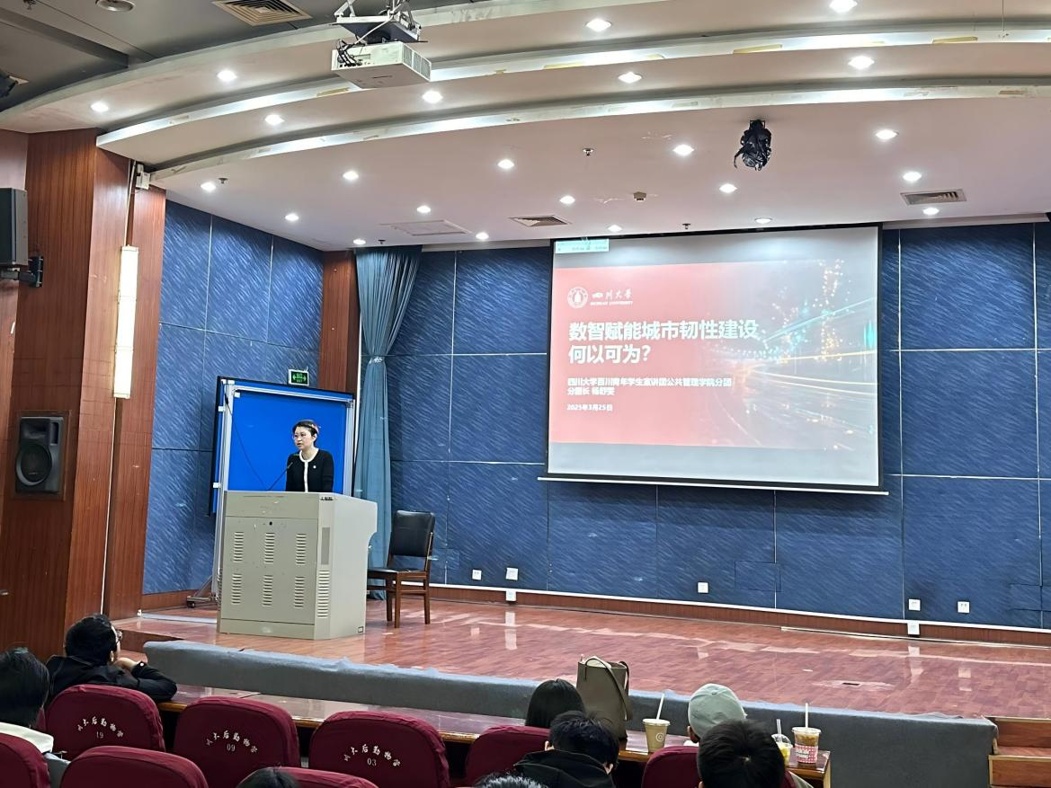 为深入学习贯彻党的二十届三中全会和全国“两会”精神,助力本科生学风建设,2025年3月25日,英国正版365官方网站百川青年员工宣讲团英国上市公司365分团在江安校区二基楼B座报告厅举办“数智赋能城市韧性建设何以可为”主题宣讲活动。活动立足新时代城市治理需求,紧扣二十届三中全会“深化城市安全韧性提升行动”战略部署,通过系统解读“城市智慧高效治理新体系”的实践路径,为2024级本科生搭建理论学习与实践认知的贯通平台。宣讲由分团指导教师陈萱源主持,宣讲团团长杨舒雯担任主讲。