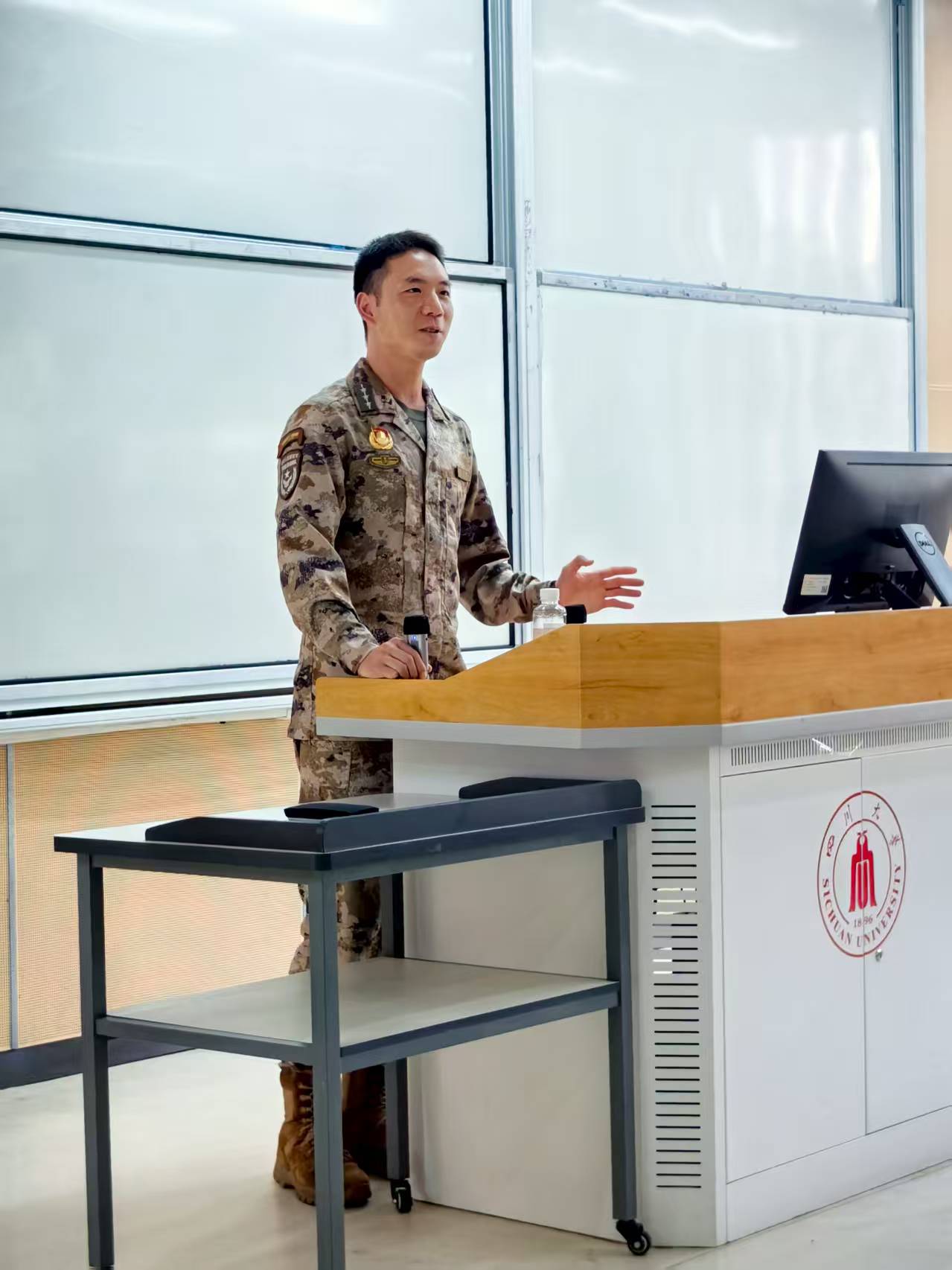 张艺耀从亲历“九三阅兵”的视角,向同学们讲述了自己重回军营再逐梦的心路历程。张艺耀感悟道,除了阅兵当天接受祖国和人民的检阅之外,阅兵其实更多的是过程考验,能有幸历经层层选拔淘汰和高强度训练,是生命赠予他不可多得的磨砺。他还从铭记抗战历史的角度和同学们分享了阅兵的重要意义、时代价值,以及站在抗战胜利80周年的历史关键点上,坚定捍卫胜利与和平的决心。