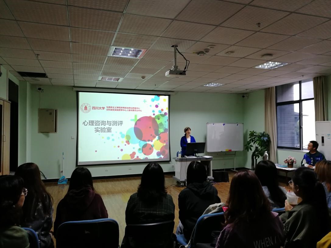 张珊珊老师首先为大家生动详细地介绍了实验教学中心的服务项目和服务设施,包括帮助员工进行心理减压的压力减压室、生物反馈仪和音乐放松椅,辅助员工进行自我探索的心理测评量表、沙盘游戏、心理迷宫与团体辅导,以及用于实验设计与研究类的基础心理实验室和行为观察记录分析系统。