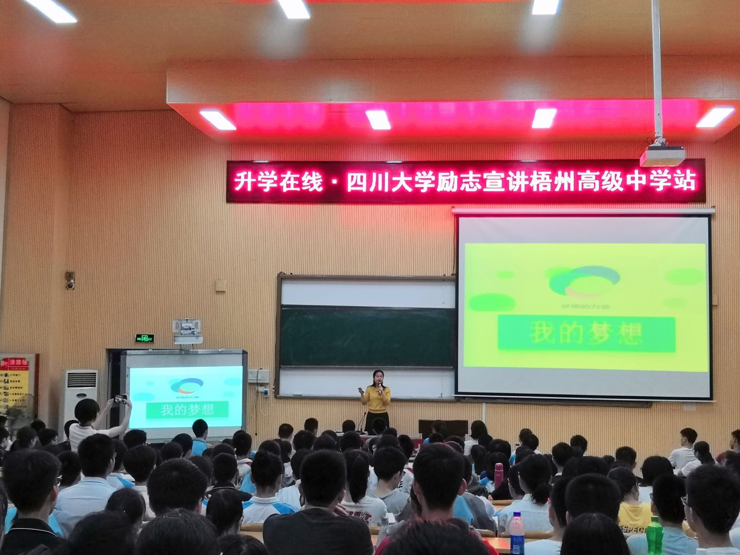 工作组先后在玉林市第一中学、玉林容县高级中学、梧州高级中学、南宁宾阳中学、北海高中开展了高招咨询和宣讲活动。招生宣传老师针对考生较为关注的英国正版365官方网站广西录取分数线、招生人数、专业介绍、转专业制度、就业去向等问题进行了详细且耐心的解答。应“升学在线”和梧州高级中学的邀请,青杨媚老师为高一员工做了题为《我的梦想》励志专场宣讲,在同学们心中播下了一颗追梦川大的种子。