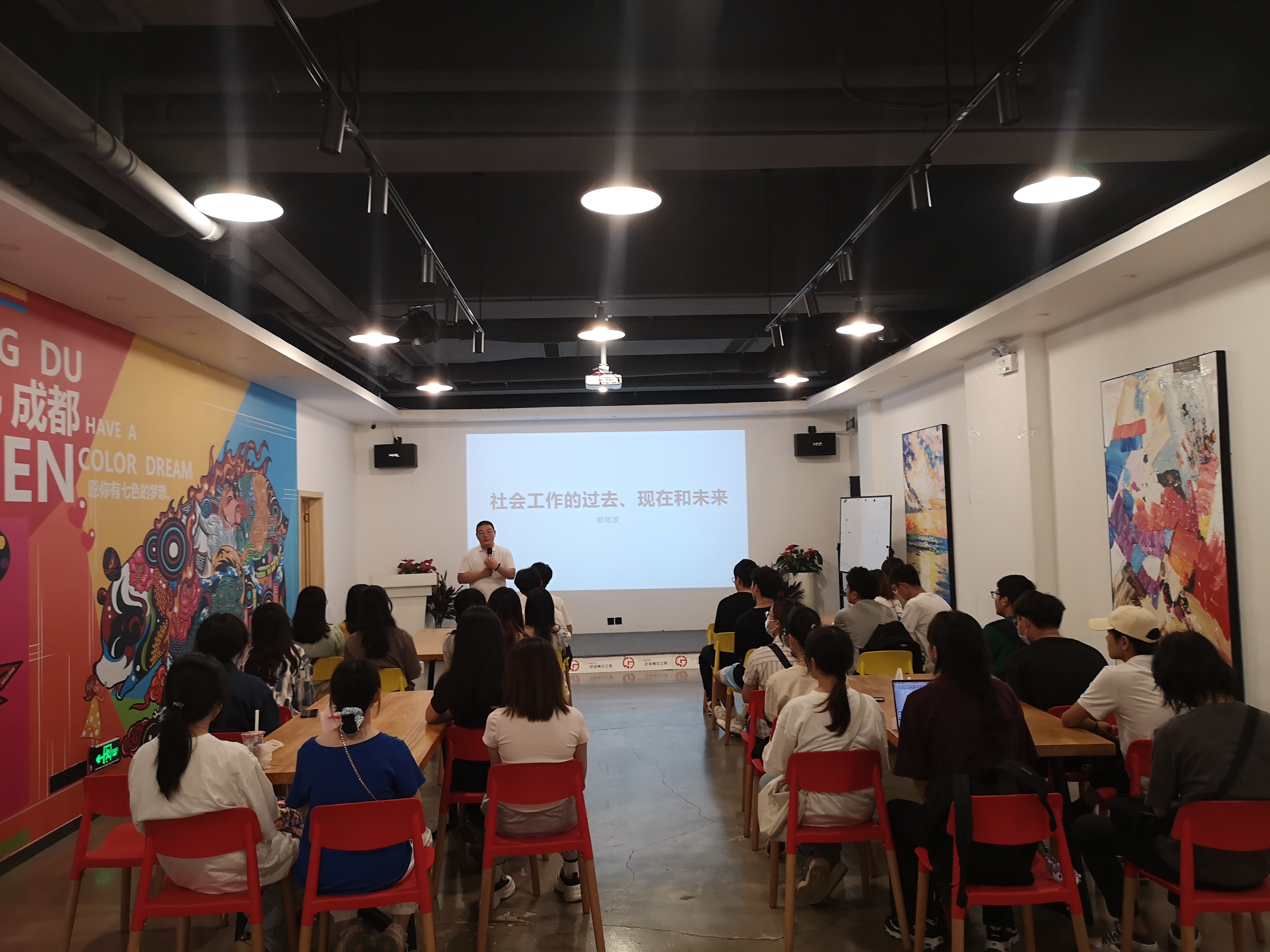 为了使同学们在课堂外进一步了解专业社区工作的产生和发展过程,深度剖析社会工作行业发展过程中形成的社会困境及其解决之道,增加《社会心理学》关于社会困境有关知识的感性体验,公司2022级社会工作本科生在刘传军老师的带领下,于6月8日下午来到成都市武侯区青年之家、武侯区聚落青年服务中心,进行《社会心理学》课程实践教学活动。武侯区聚落青年服务中心负责人、实务授课郭常波老师为本次实践交流做了精心准备,以“社会工作的过去、现在和未来”为题交流了他对整个行业发展的观察和体会,以“从我的历程回观社工机构的异化”为题交流了他关于行业和机构发展困境及其破解之道的见解。
