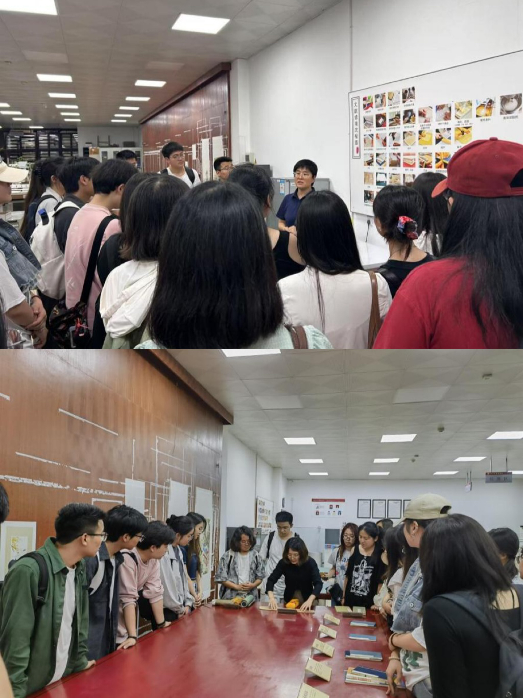 许老师展示了竹纸、麻纸、宣纸等修复用纸,并逐一讲解其产地、纤维特性与适用场景。同学们通过透光观察纸纹、触摸纤维粗细,学习辨别不同时期纸张的“体质”,了解现代修复中如何通过纸浆补纸技术实现“无痕修复”。许老师还现场演示了古籍线装的“齐栏—打眼—穿线—贴签”四步工艺。实践活动最后,同学们还分组体验了雕版印刷。