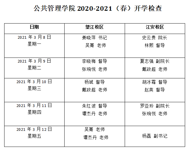 1、公司提前制定开学教学检查一周工作安排表,做到望江、江安两个校区全覆盖,并将开学教学检查责任落实到个人,全院正副职院领导、本科教学督导组成员、本科教务秘书、本科教学管理人员等参与检查。公司党委书记姜晓萍、经理史云贵、副书记杨磊、副经理夏志强、副经理罗亚玲,本科教学督导组胡冰霜、杨斌、赵英、朱红波、李晓梅等老师、本科教务秘书林熙老师以及本科教学管理人员吴菁、戴政超、谭杰丹、张琬悦等对新学期的课程安排与上课情况进行了检查。开学检查分设望江校区和江安校区两个部分,以下是公司制定并依之执行的开学教学检查安排表: