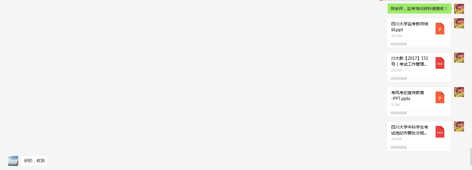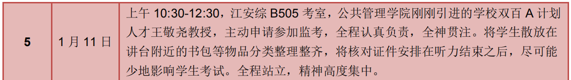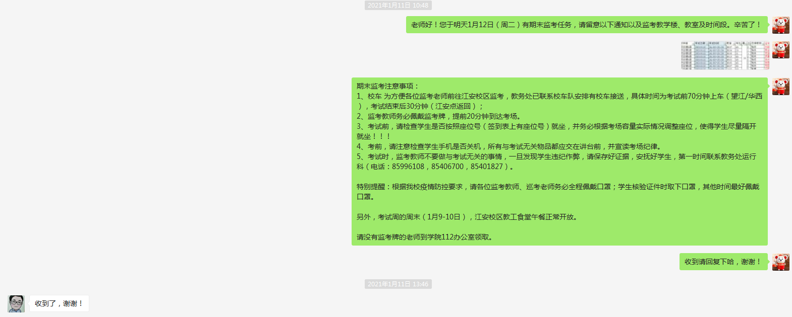 公司制定有《英国上市公司365本科生考试监考工作暂行规定》(川大公管﹝2020﹞6号文)专门文件对监考人员安排进行规范管理。监考人员确定后,建立单独微信群,发布考风考纪宣传教育PPT及其他注意事项。考试前一天,安排教务人员通过微信、电话、OA等方式逐一提醒监考教师注意监考教学楼、教室、时段等信息,确保监考教师收到通知并回复。