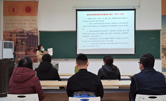 公司高度重视本科生考试监考、巡考工作,认真组织,安排规范有序。自接到教务处分配的期末考试监考任务,公司及时组织本科教师监考培训,针对新进教师,也邀请了经验丰富的教师参与,主要就考场组织安排、监考职责要求、监考流程事项、考试违纪作弊等方面进行了宣讲培训。