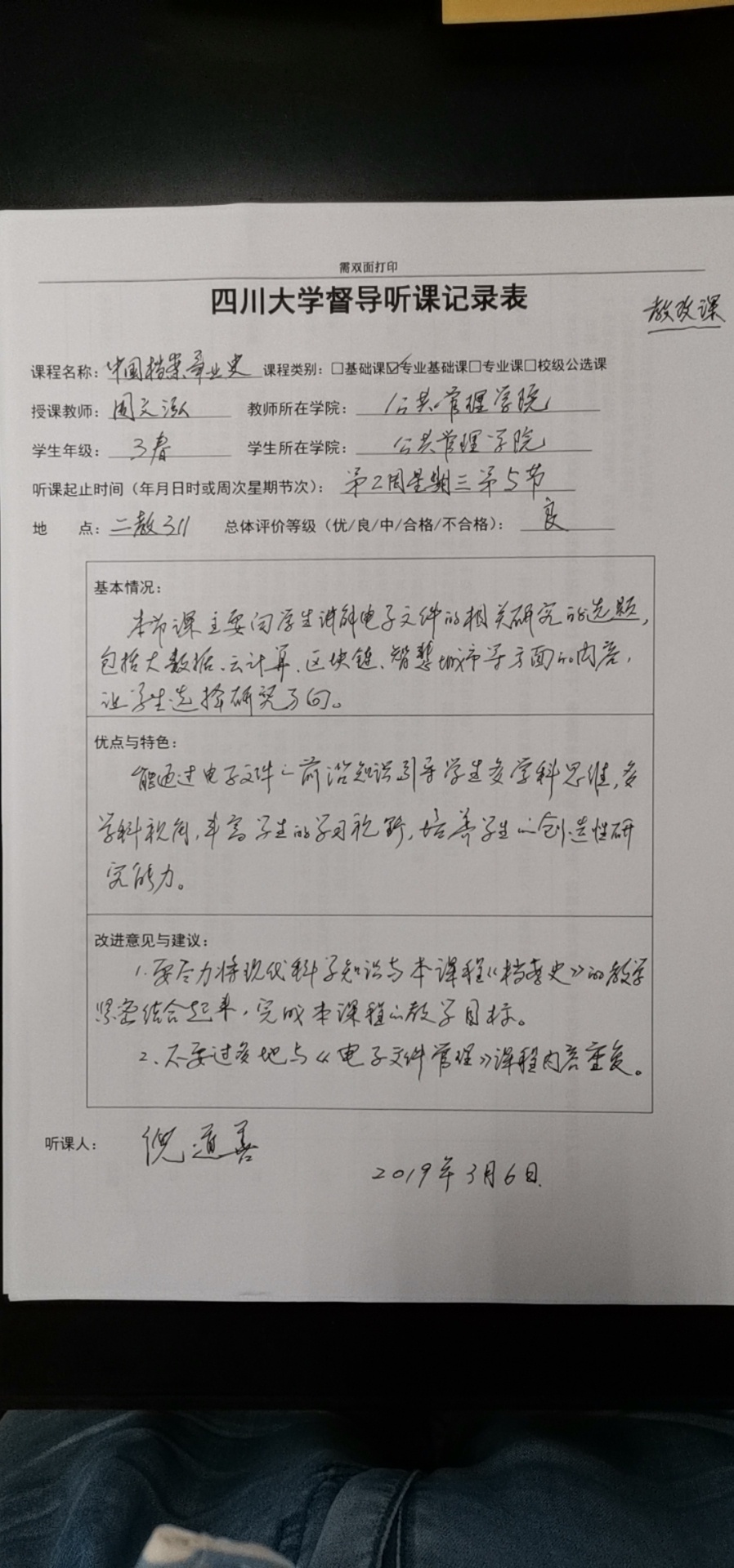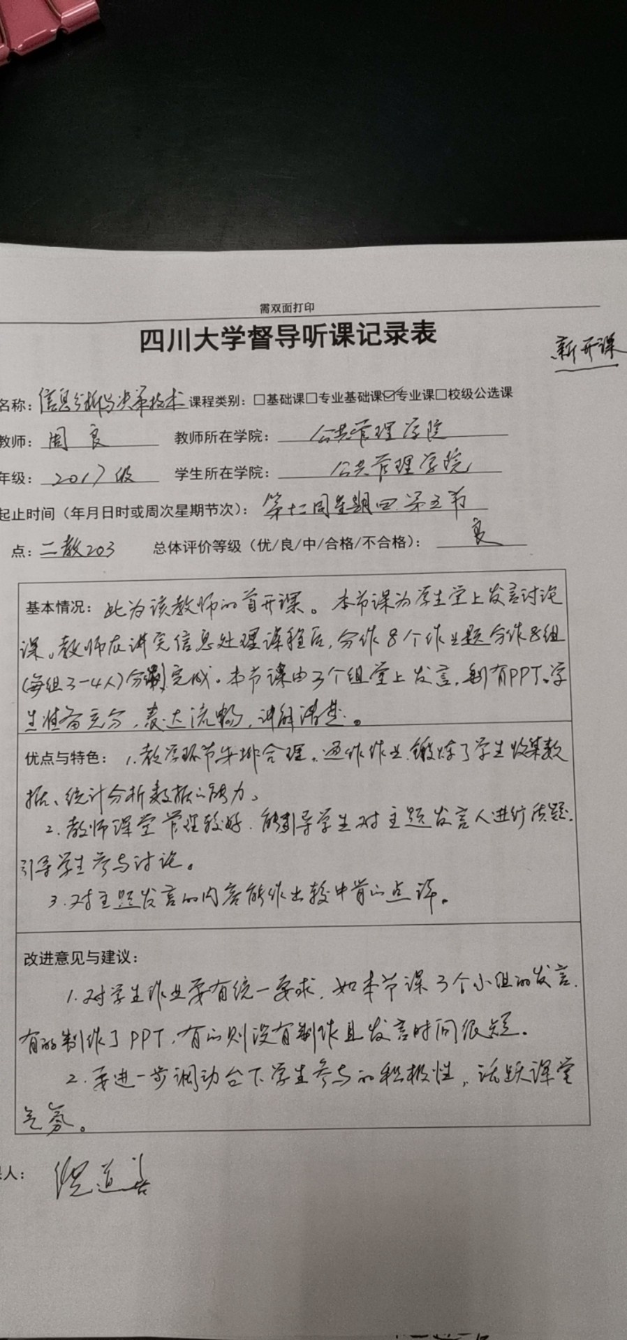 例如督导组副组长倪道善老师,听课前充分调查,重点听取新开课、新教师课、精品课、教改课,根据课堂教学内容、方式及师生互动课堂效果等,反馈改进意见或者推荐原因。