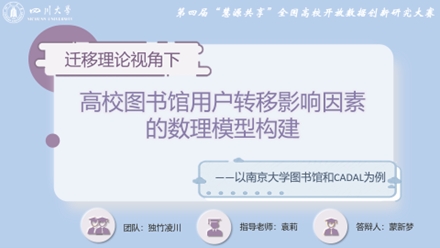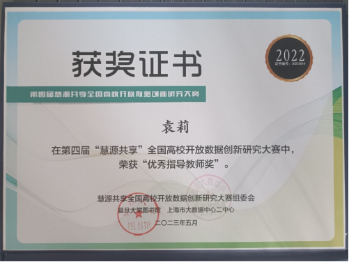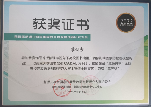 在袁莉老师的悉心指导下,公司信息资源管理专业2021级本科生蒙新梦同学的“独竹凌川”团队,以《迁移理论视角下高校图书馆用户转移影响因素的数理模型构建——以南京大学图书馆和CADAL为例》为题,探究高校图书馆用户由传统图书馆向数字图书馆转移的影响因素,为高校图书馆的发展探寻新方向,最后经过激烈答辩,荣获“三等奖”,袁莉老师获得“优秀指导教师奖”。